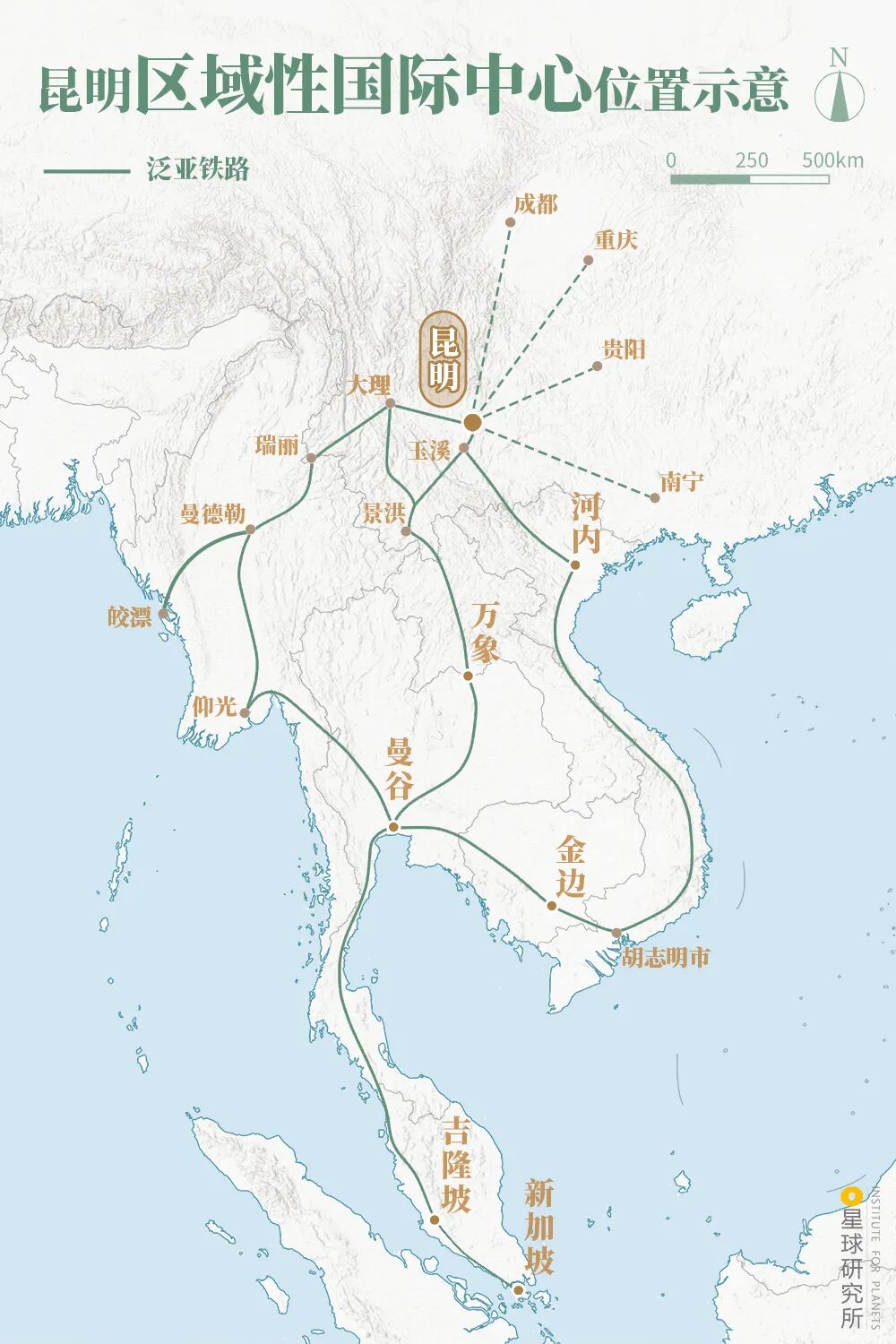 (昆明区域性国际中心位置示意,制图@巩向杰&王申雯/星球研究所)