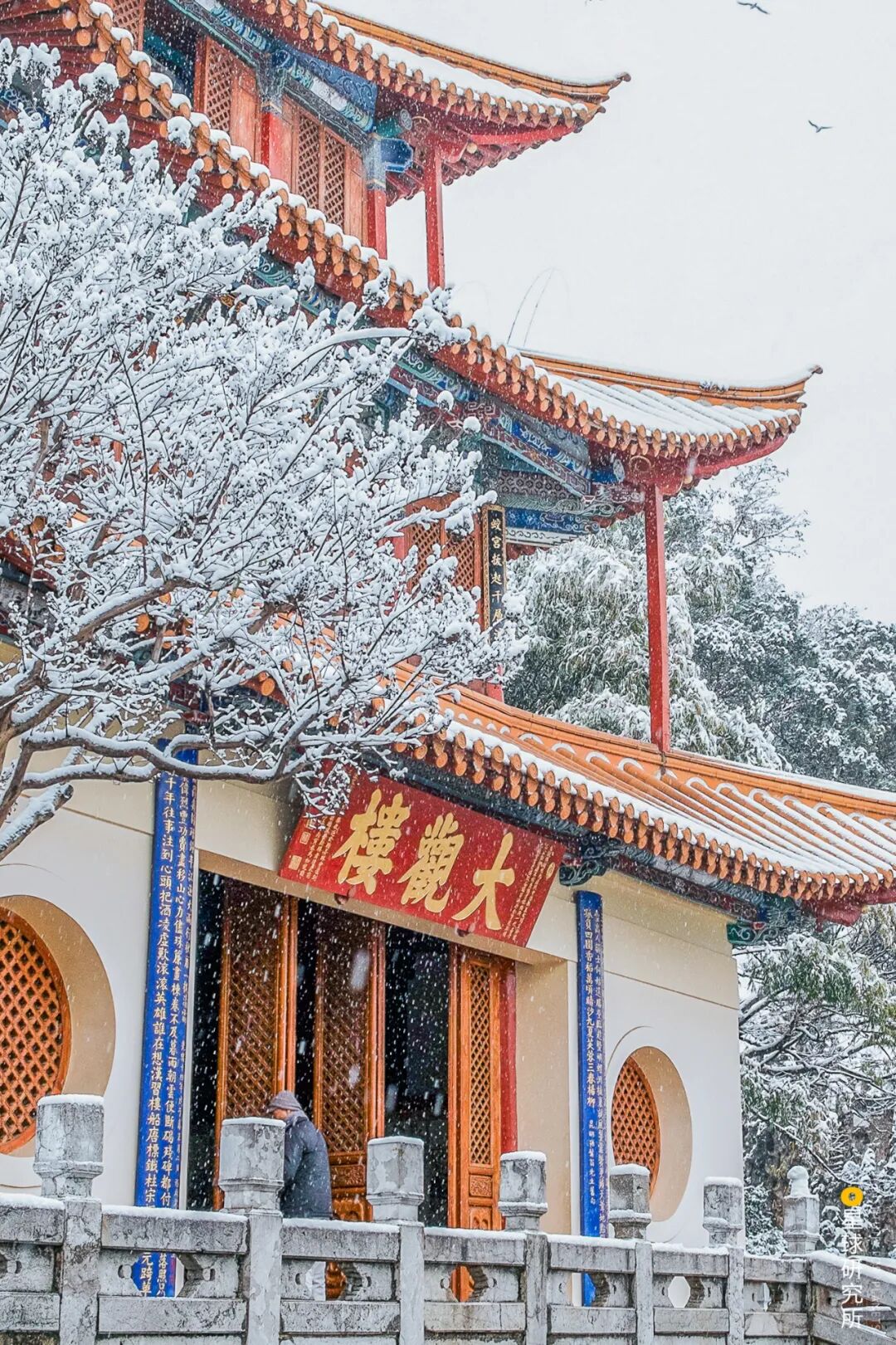 (雪后的大观楼,门口悬挂的即为大观楼长联,摄影师@苏剑飞)