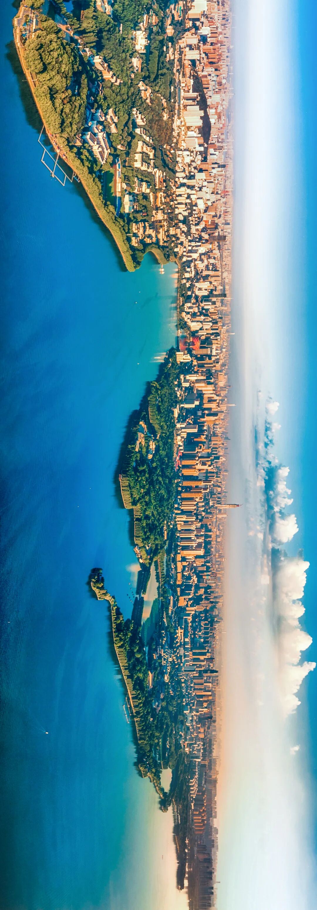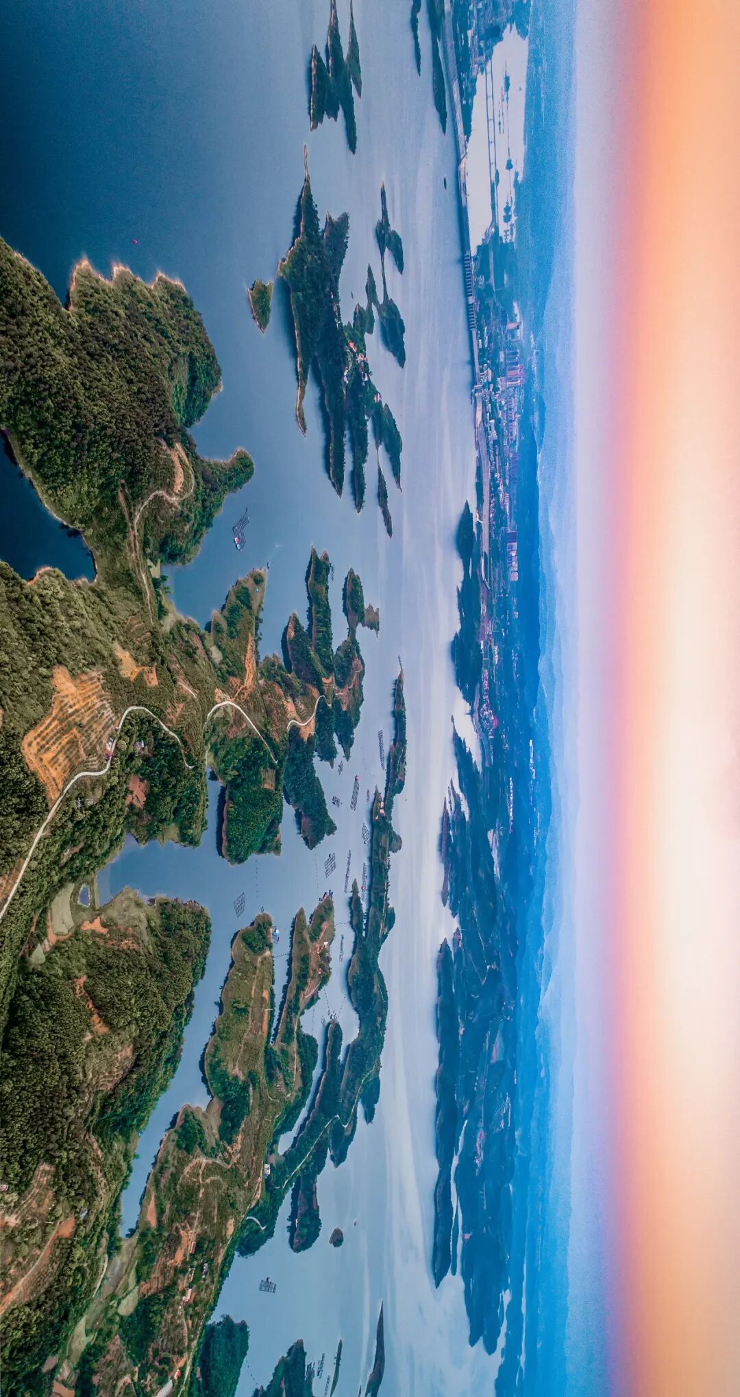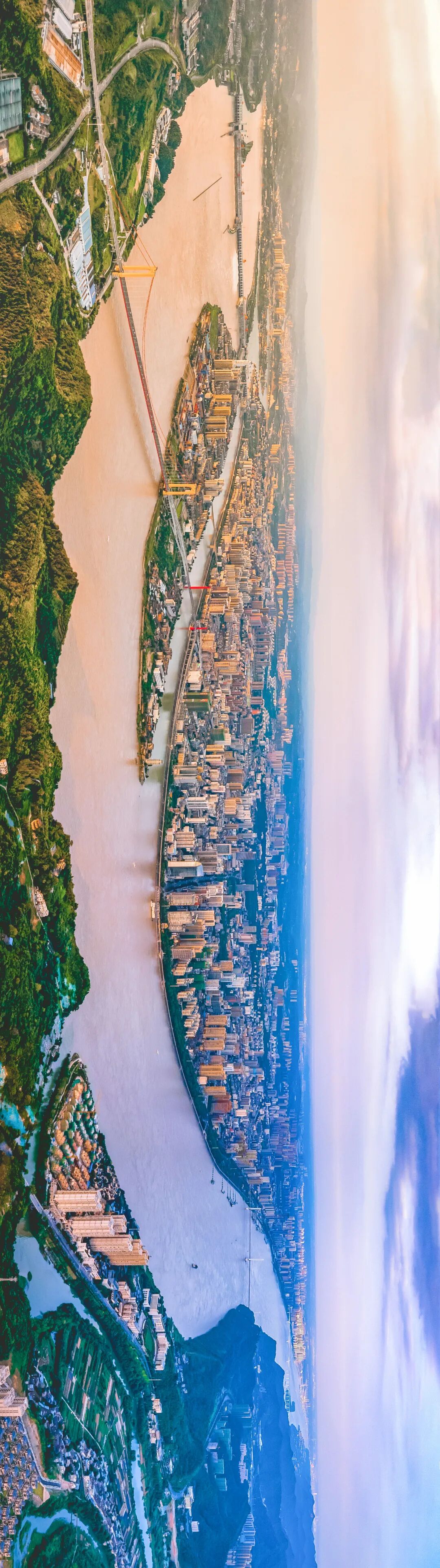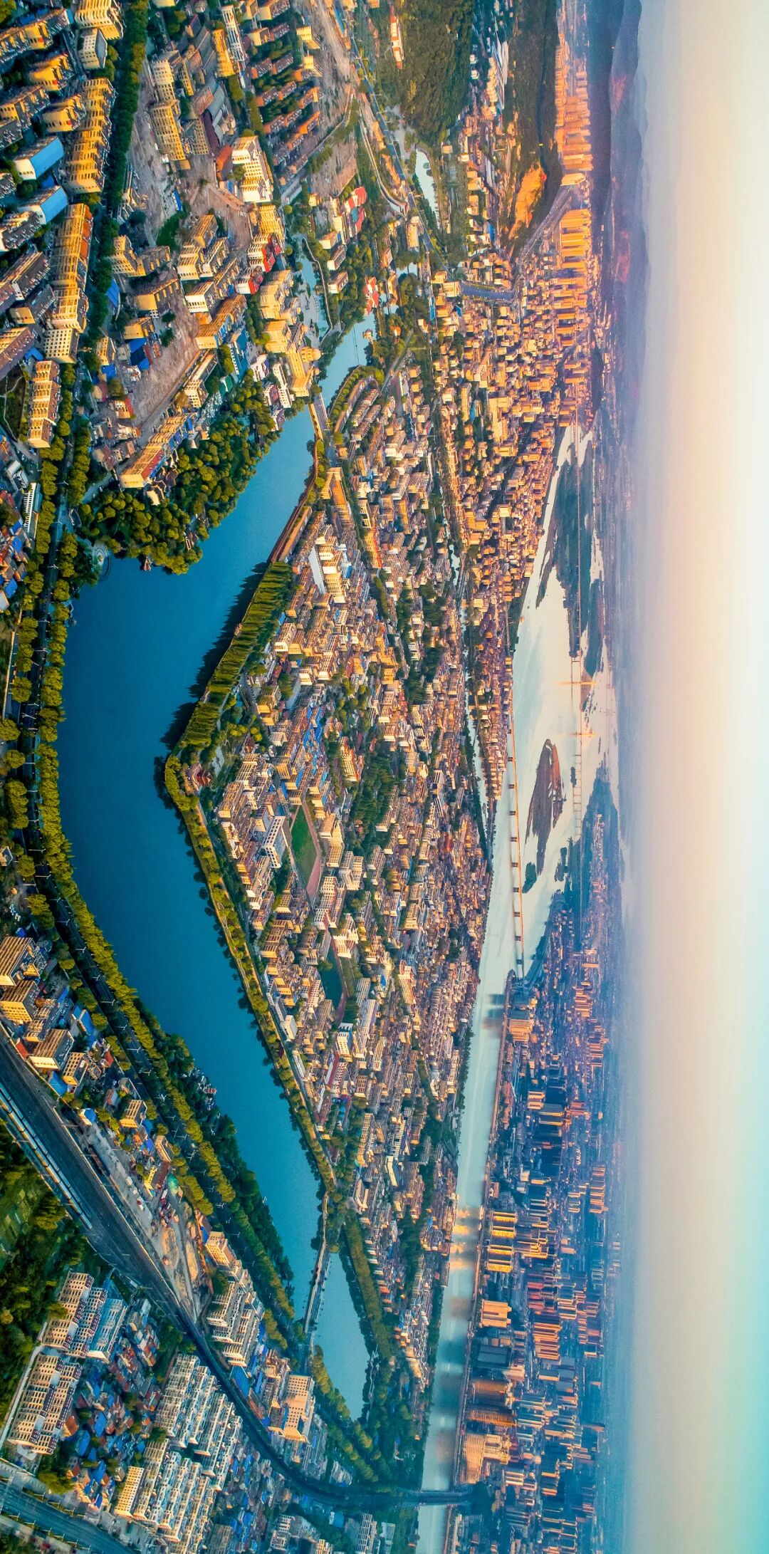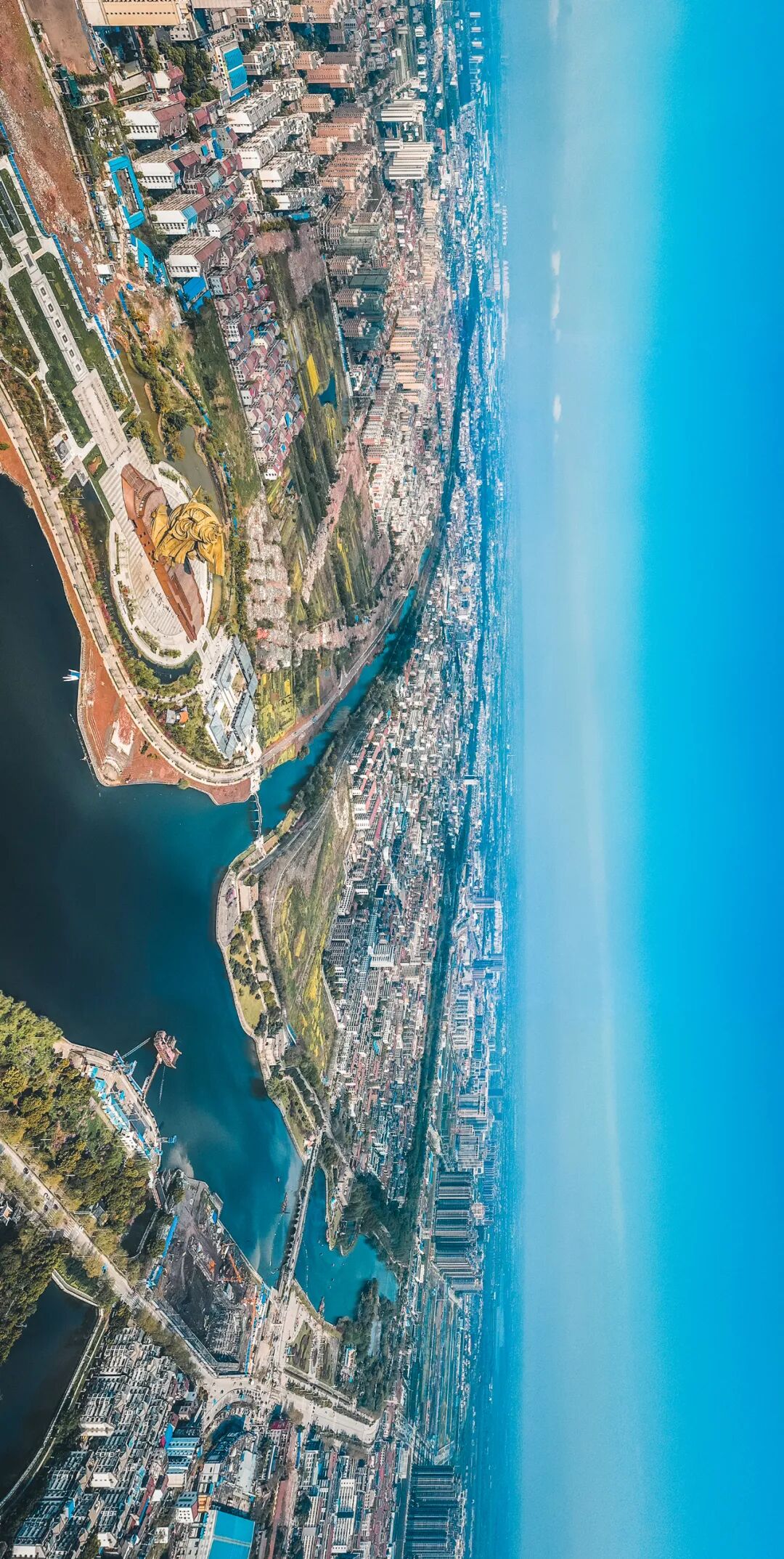 (请横屏观看,宜昌鸟瞰,是三峡工程所在地,被誉为“世界水电之都”,画面左端水坝为葛洲坝,摄影师@李理)