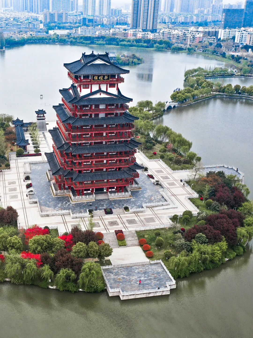 (天门西湖茶经楼,因天门为茶圣陆羽故里而建的仿唐代建筑,摄影师@张乔)