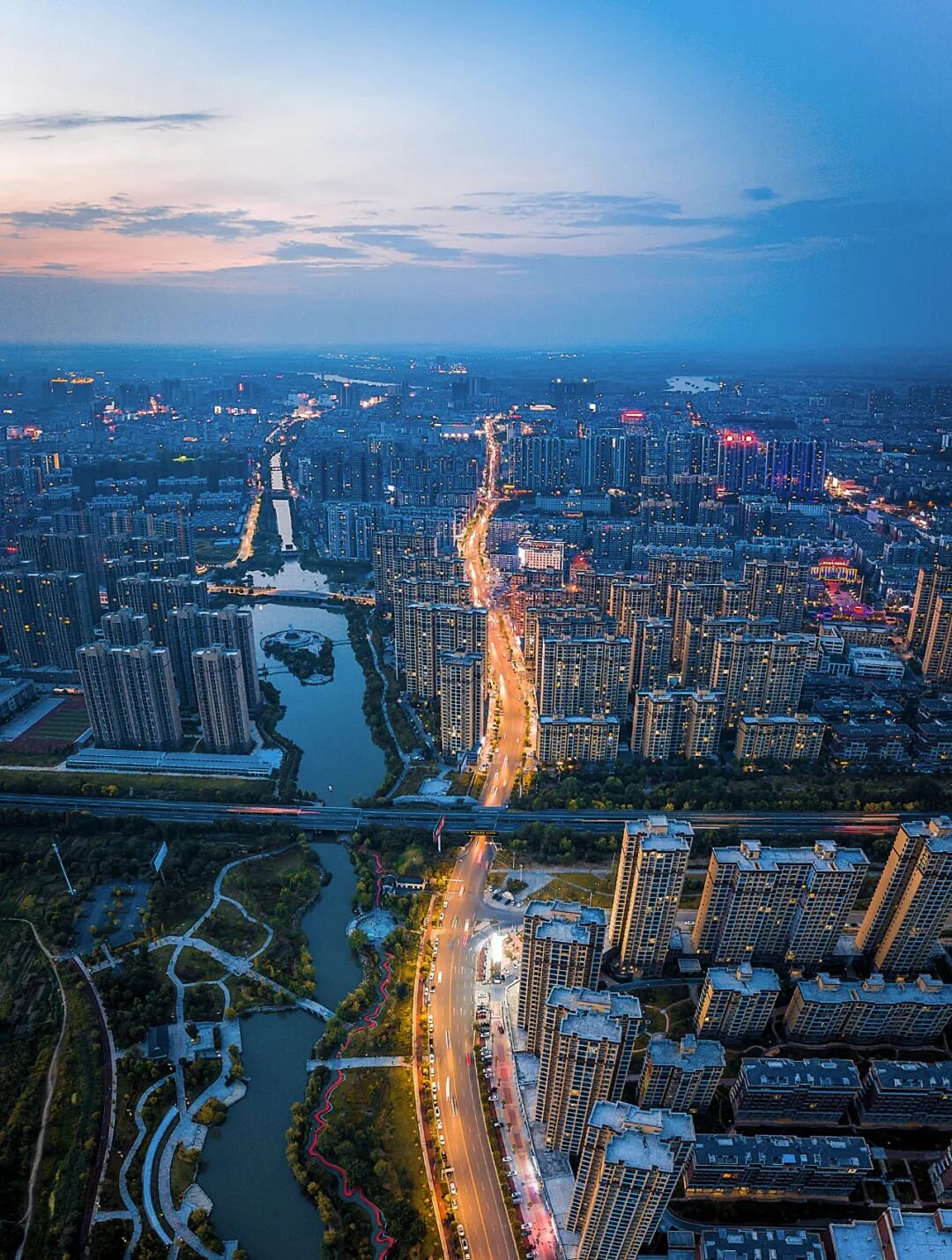 (请横屏观看,荆州古城鸟瞰,画面中部为荆州古城,外围一圈为护城河,左下为手持70米长刀的关羽像,摄影师@邓双)