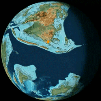 (印度洋板块与欧亚板块碰撞示意图,因为碰撞过程复杂,圆点仅为云南的大致位置,与实际可能有偏差,原视频制作@Christopher Scotese)