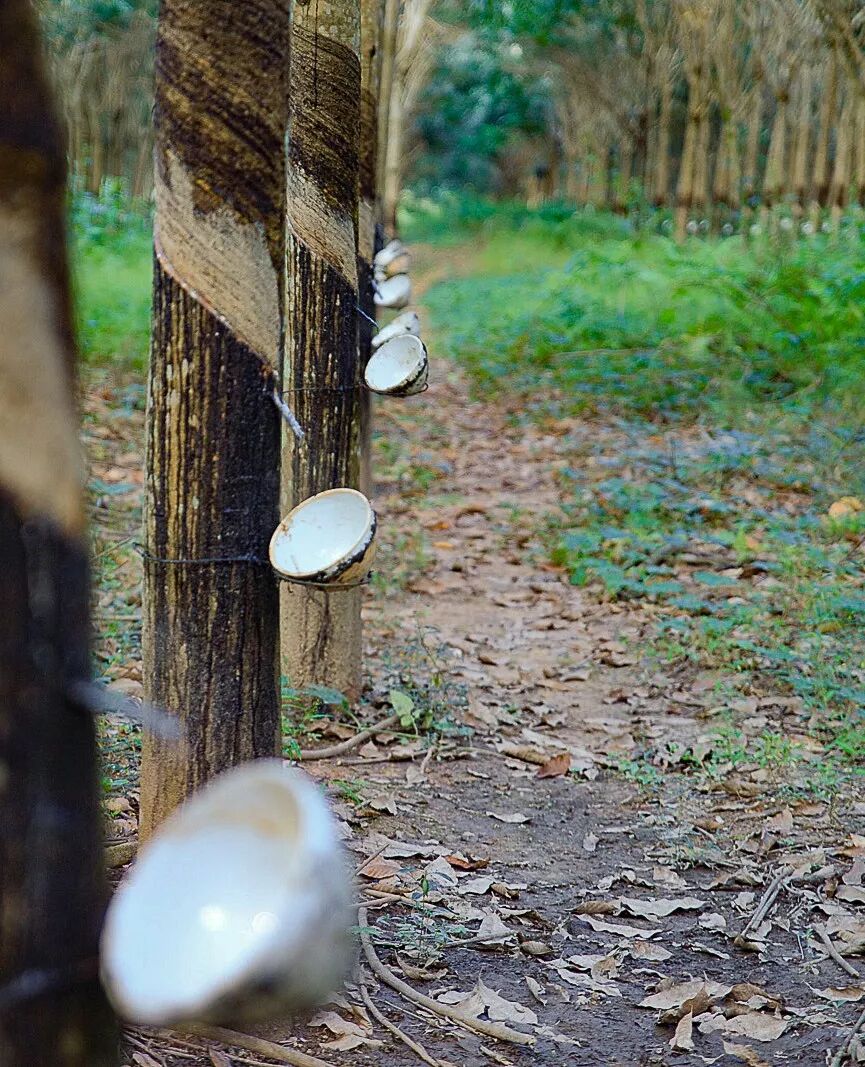 (西双版纳橡胶园,树上绑的碗用于接胶,摄影师@释放自己xy)