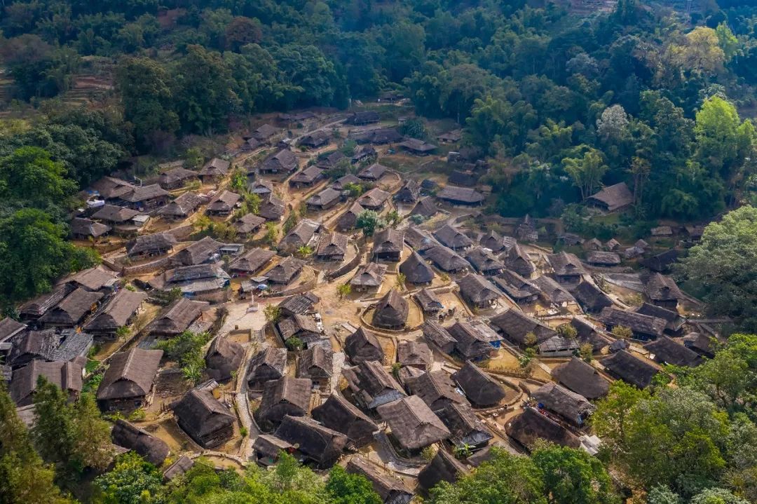 (临沧翁丁佤族村寨,房屋一般用竹木搭建、稻草覆盖、竹笆围墙,远望如一丛丛蘑菇,摄影师@刘珠明)