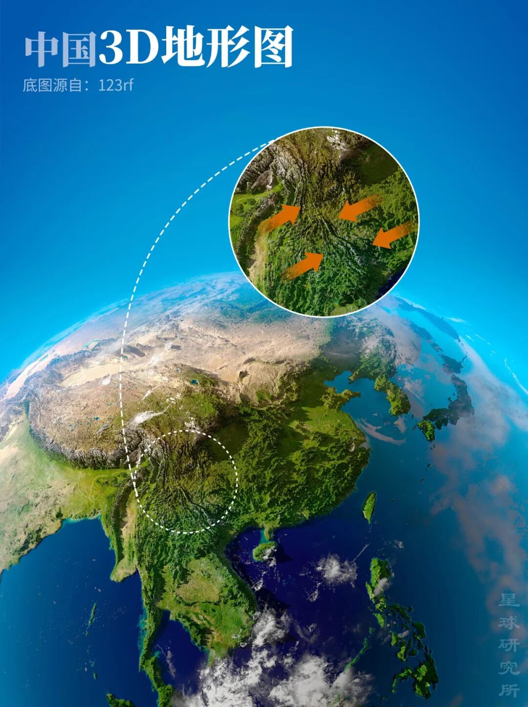 (中国3D地形图,可以看出云南的褶皱比其他地区更显著,制图@郑伯容&巩向杰/星球研究所,底图源自123rf)