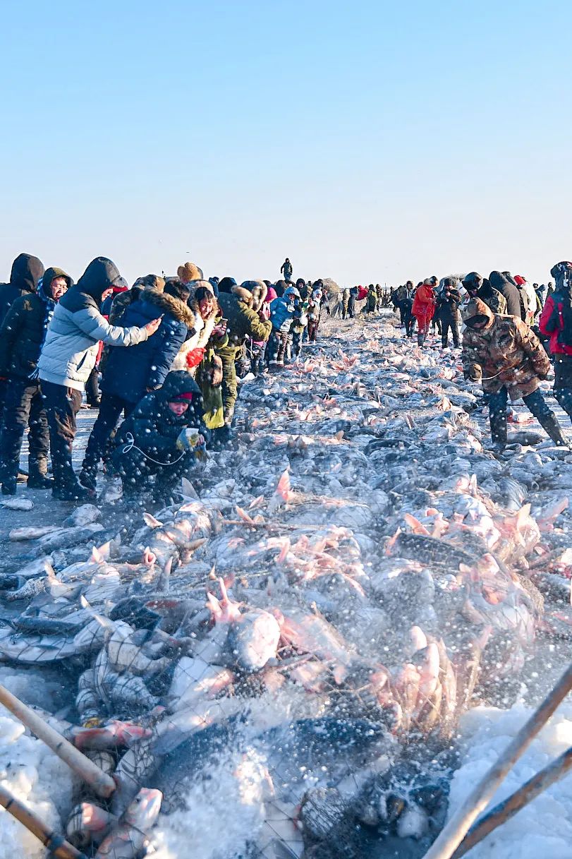 (查干湖冬捕,单网捕捞量可达30万斤,拍摄于吉林松原,图片来源@视觉中国)