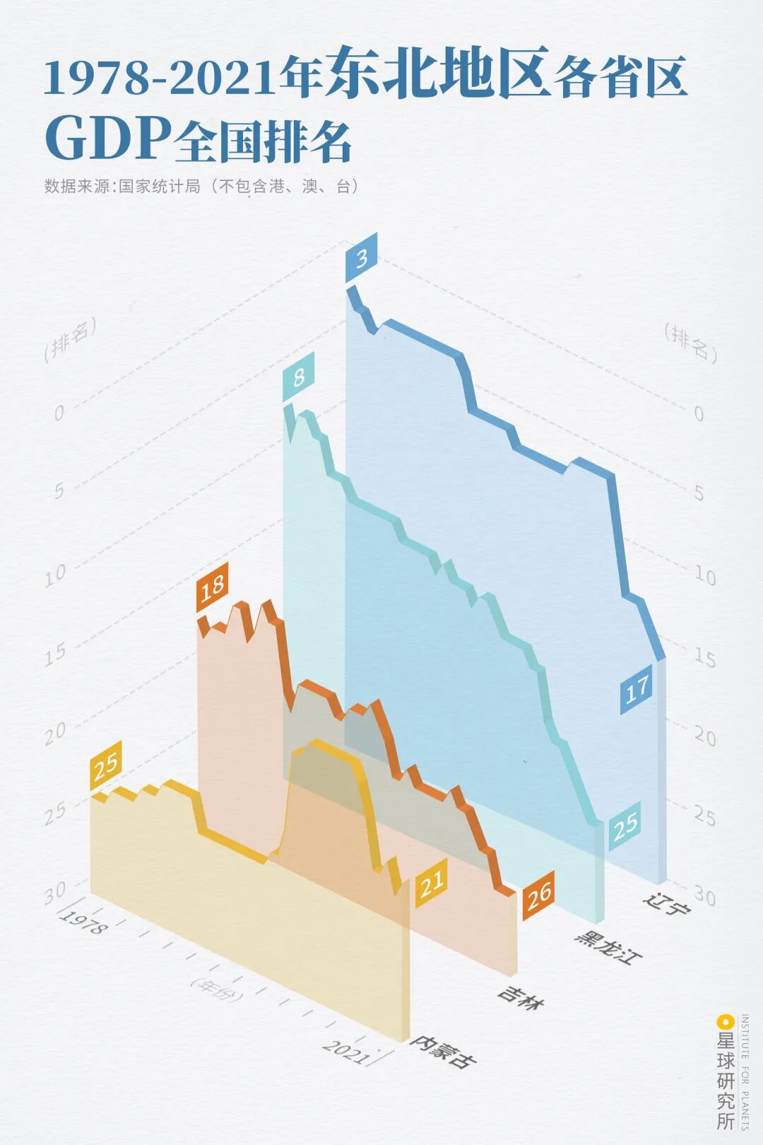 (1978年至2021年,辽宁、黑龙江、吉林三省GDP在全国31个省级行政区(不含港澳台)中的排名分别下降了14、17、8位,内蒙古自治区上升4位,制图@李雪茜/星球研究所)
