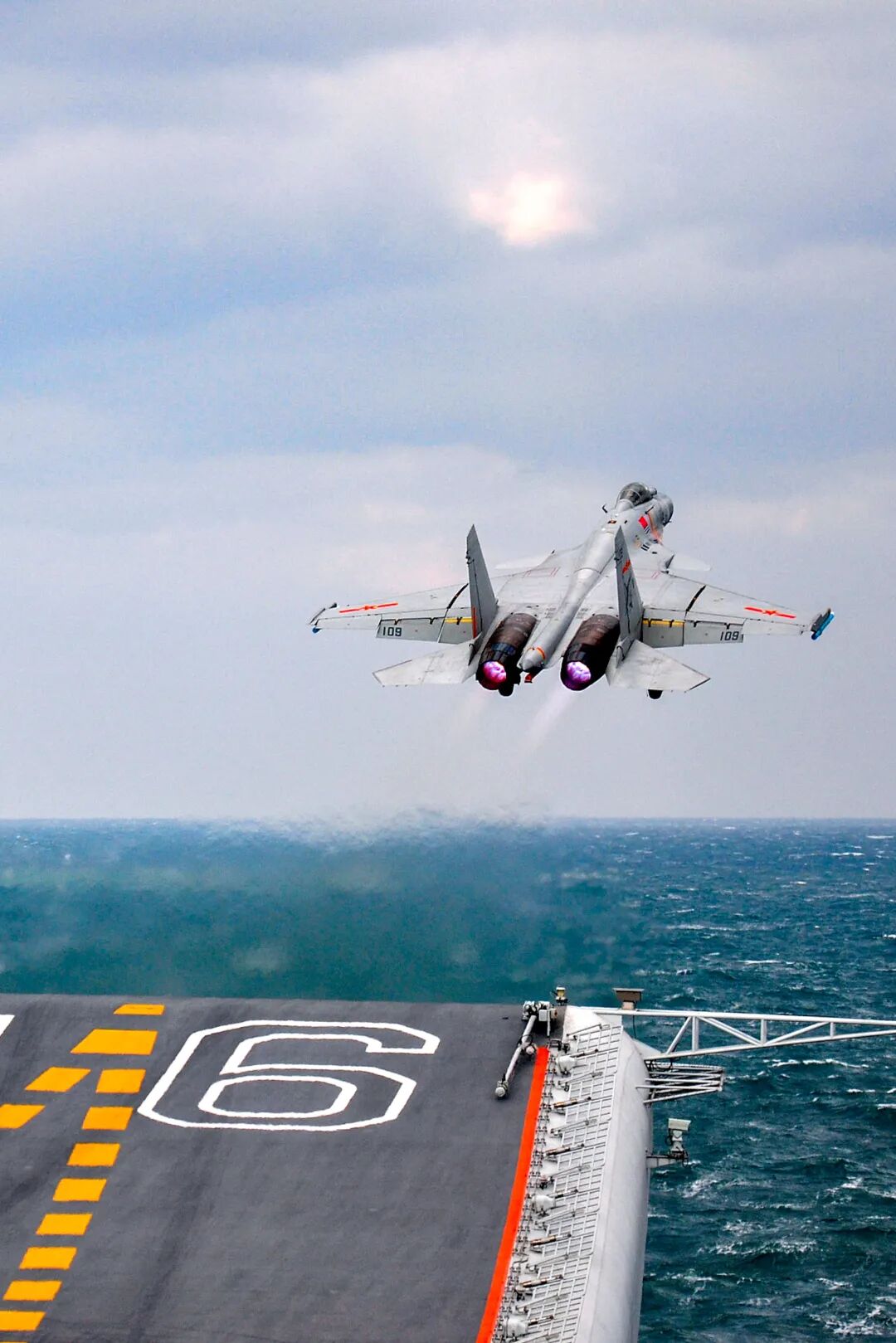 (“沈飞”生产的歼−15舰载机在“辽宁舰”上起飞,图片来源@视觉中国)