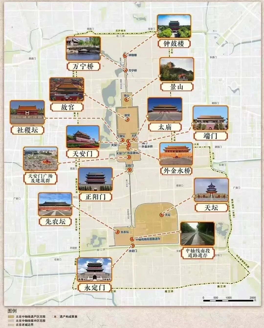 “北京中轴线”15个遗产构成要素为:钟鼓楼、万宁桥、景山、故宫、端门、天安门、外金水桥、太庙、社稷坛、天安门广场及建筑群(天安门广场、人民英雄纪念碑、毛主席纪念堂、国家博物馆和人民大会堂)、正阳门、南段道路遗存、天坛、先农坛、永定门,遗产区面积589公顷,缓冲区面积4542公顷。