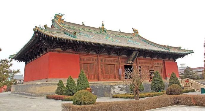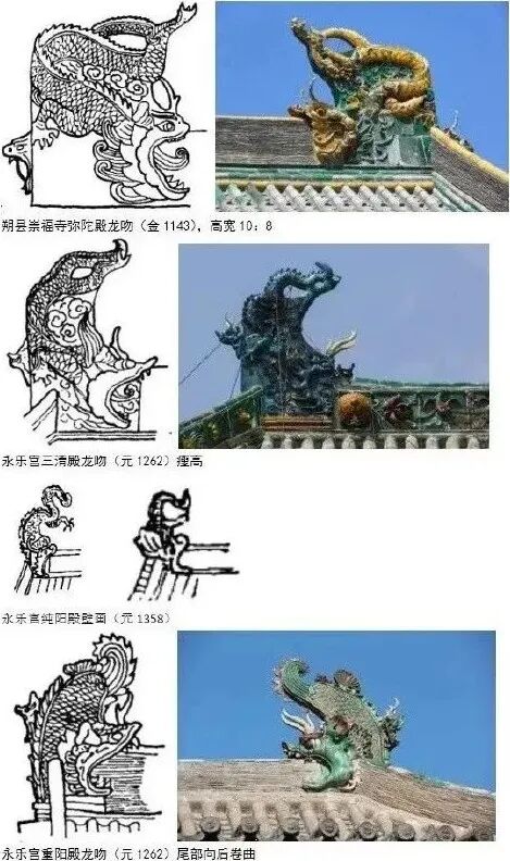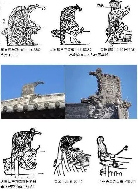 宋辽金的鸱吻中,龙这样的异兽形象更加流行。鸱吻的装饰也越来越繁复。如宋代晋祠圣母殿和金代崇福寺弥陀殿。