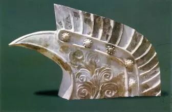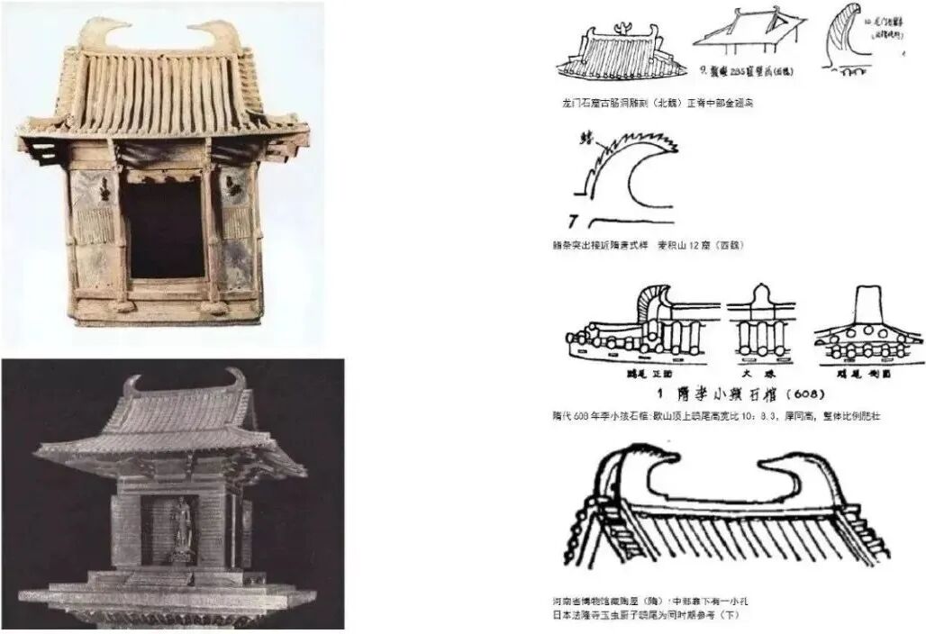 在唐代成书的《北史·宇文恺传》和《晋书·安帝纪》中第一次出现了“鸱吻”的名称,从目前出土的北朝和唐代遗物来看,唐代鸱吻的样子逐渐定型,多呈瘦高的鱼型,在一些佛教建筑中还有呈鸟羽状的鸱吻,以象征西方极乐世界的妙音鸟。