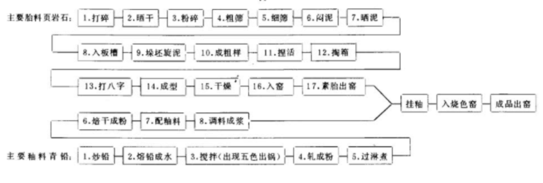 采来的页岩石去掉渣子进行晾晒,名为“晾土”,所需时间号称“三伏两夏”,即一至二年。经过晾晒后,再碾轧碎粉用粗筛将土末筛去,再用70一80目绢罗筛出细粉,放在水池中沉腐,浸润成泥,一般经五至七天,名为“闷泥”。闷泥时间越长越好,目的是去其暴性,加强其塑性,成泥以后,再进行搅拌揉合。以柔软泽润的程度为准,旧时一般是人工用双脚践踏,在南方也有用牛践踏的。践踏到以不粘脚为度,这个工序称为“弄熟”。胎泥弄熟,即进行制作粗坯。