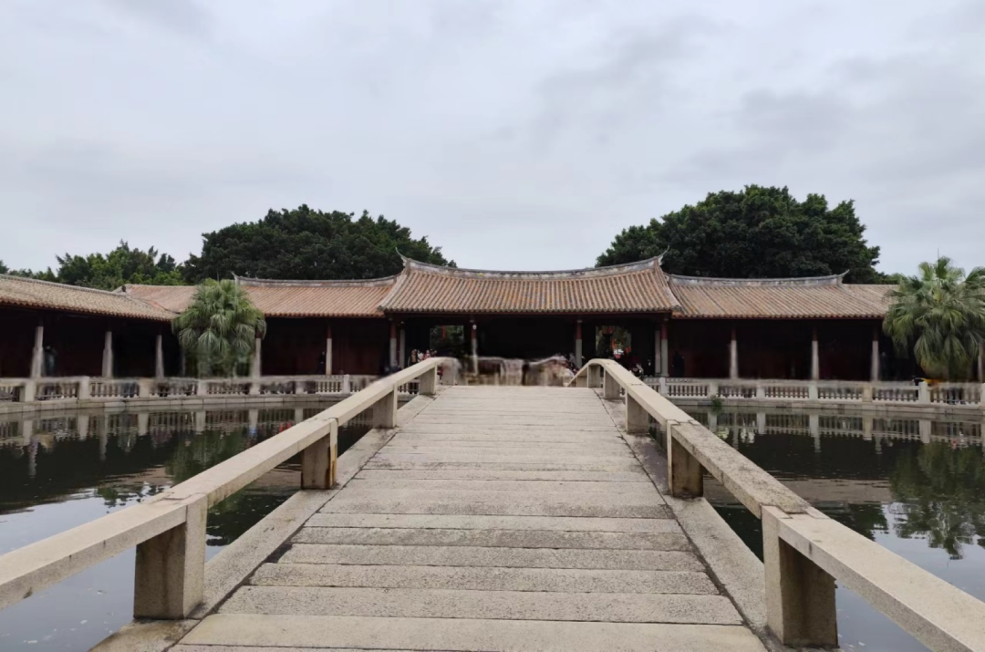 大成门内是半月形泮池,上有元代建造的泮桥。泮桥为梁式石构,中部拱起,桥面铺长条石 72块,象征七十二贤人。桥端栏板上雕对石象,东雌西雄,象征太平景象,在闽南古桥栏柱中实属罕见。过泮桥为广阔的石铺院庭,东西两侧建廊庑,全长112米,宽10米,原供奉孔子弟子及后代圣贤牌位。如今有栏杆围住,已经不让上桥。