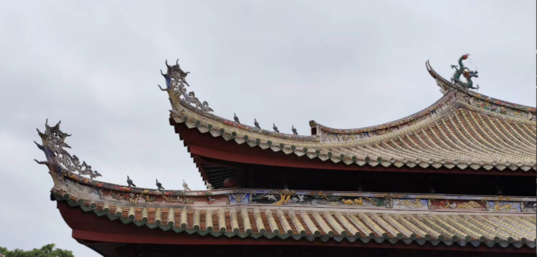 大殿屋顶为重檐庑殿顶,正脊弯曲度大,翼角起翘明显,整体轮廓线舒缓式翘起,正脊两端还雕饰着彩瓷贴塑双龙抢珠,其余各脊饰以泥塑、剪粘、彩绘,装饰图案有飞禽走兽、花卉草木等,色彩艳丽,装饰十分富有闽南建筑艺术特点。