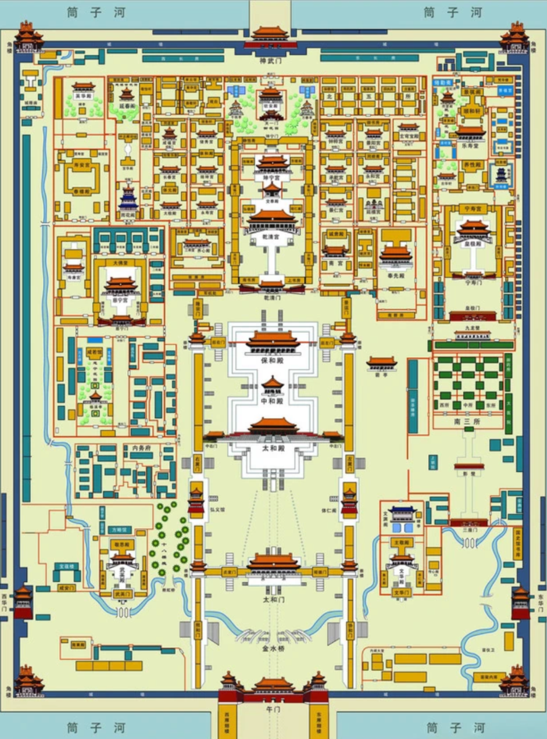 在午门之内,大殿之前有一门叫奉天门,东西角有东西角楼。东角的南面有个左顺门,左顺门南边是文渊阁,西角的南面是右顺门。奉天门内是奉天殿,大殿之后是盖华殿,之后是谨身殿。从左顺门进入,东边是文华殿,从右顺门进入,西边是武英殿。在谨身殿后面是乾清宫,之后是坤宁宫,还有春和殿和柔仪殿两殿。