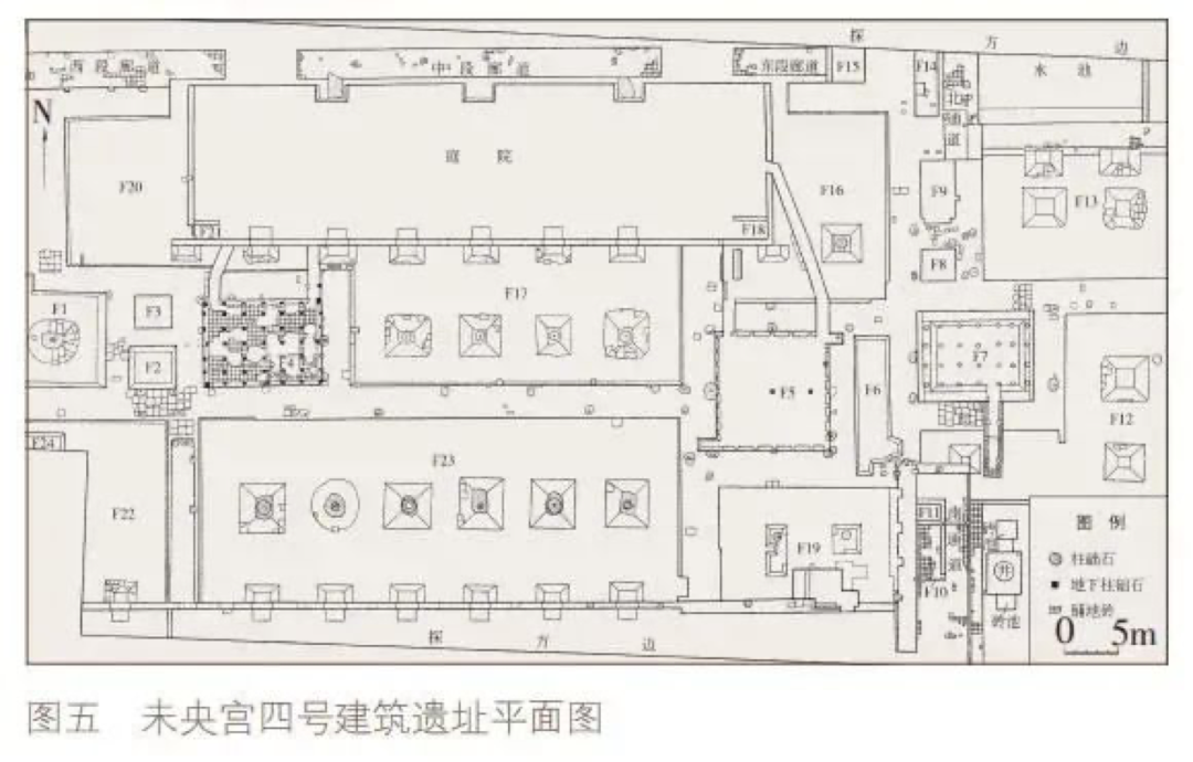 考古发掘的汉长安城未央宫四号建筑,位于前殿西北430米处,由南、北大殿及附属建筑和院落组成。南、北殿是建筑群中的主体建筑。南殿面阔7间,进深2间,东、西两侧各有一座附属的大型建筑。北殿面阔5间,进深2间,东、西两侧各有一座建筑考究的房屋,地面上有规律地分布着方形础石,础石上搭木梁,木梁上铺木地板。南、北殿及其附属建筑的地面都铺设木地板。此外,还有储藏室、通道、门房以及水池、水井等。该遗址出土了大量“汤官饮监章”封泥,“汤官”属少府,该建筑应为少府或其所辖的主要官署建筑,建于西汉时期,毁于王莽末年的战火。
