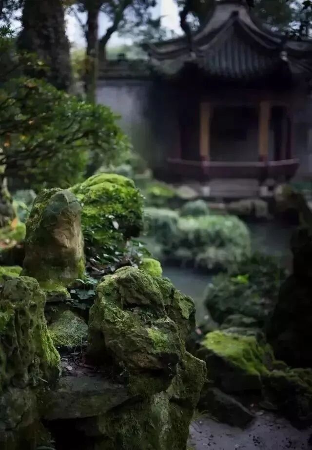 花丛间,池岸之畔,用石子铺地,或者用碎瓦片斜着铺砌,雨淋久了生出苔藓,自然而古雅。