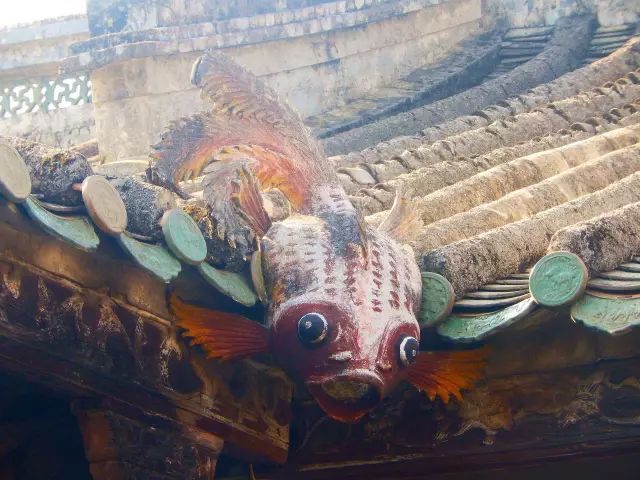 不仅中国宫殿里有这种滴水神兽,越南的顺化皇城也毫不例外,在两处屋顶的交接处,装饰了一个巨大的龙形滴水神兽,在满足排水的功能外,在敬畏天地鬼神的年代,其辟邪压胜的象征意义,还给居住者一种精神上的慰藉。