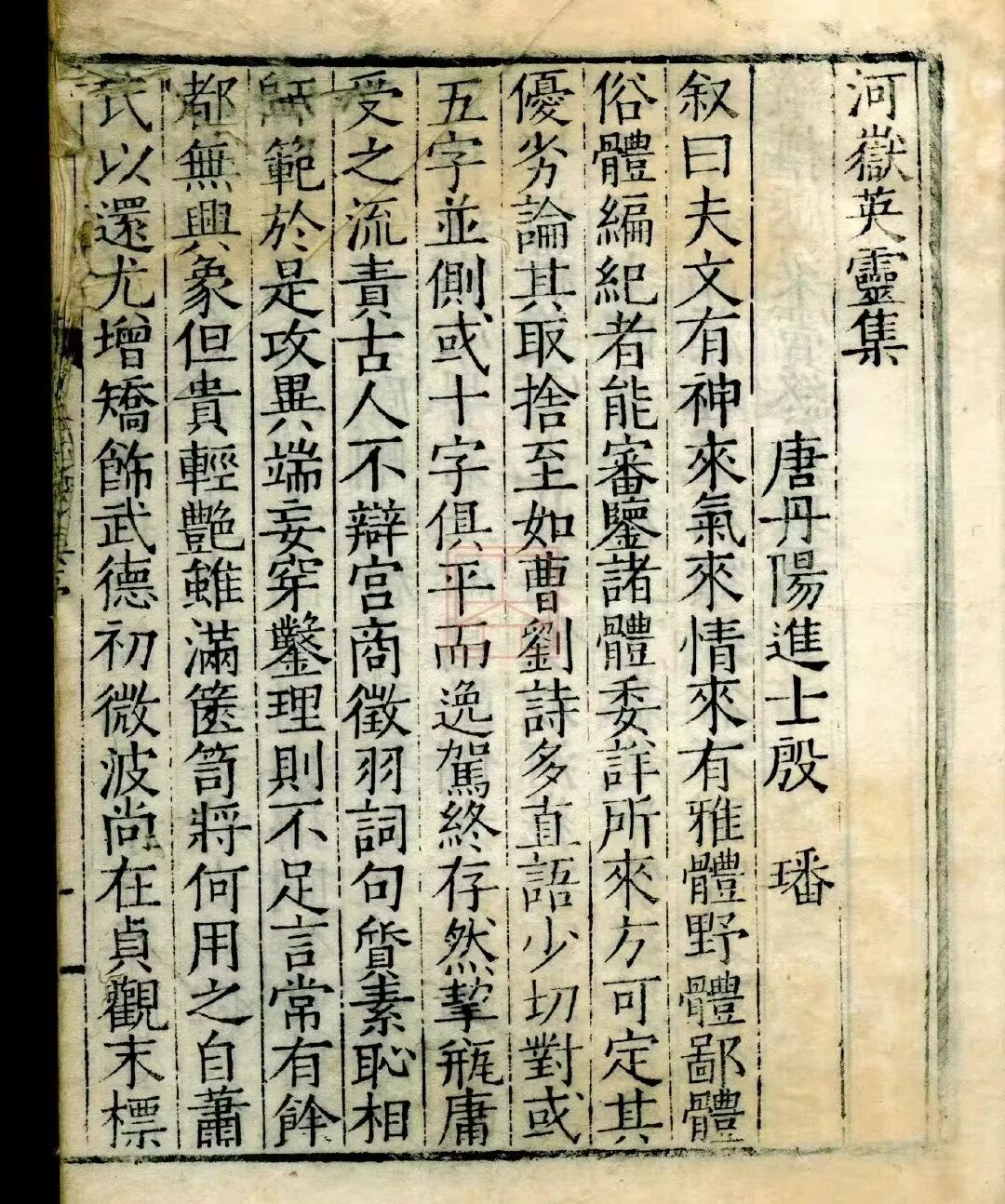 唐 殷璠辑 《河岳英灵集》 明嘉靖刻公文纸印本 《河岳英灵集》为唐人诗歌选集,集中选王维诗十五首,为诸子之冠冕。