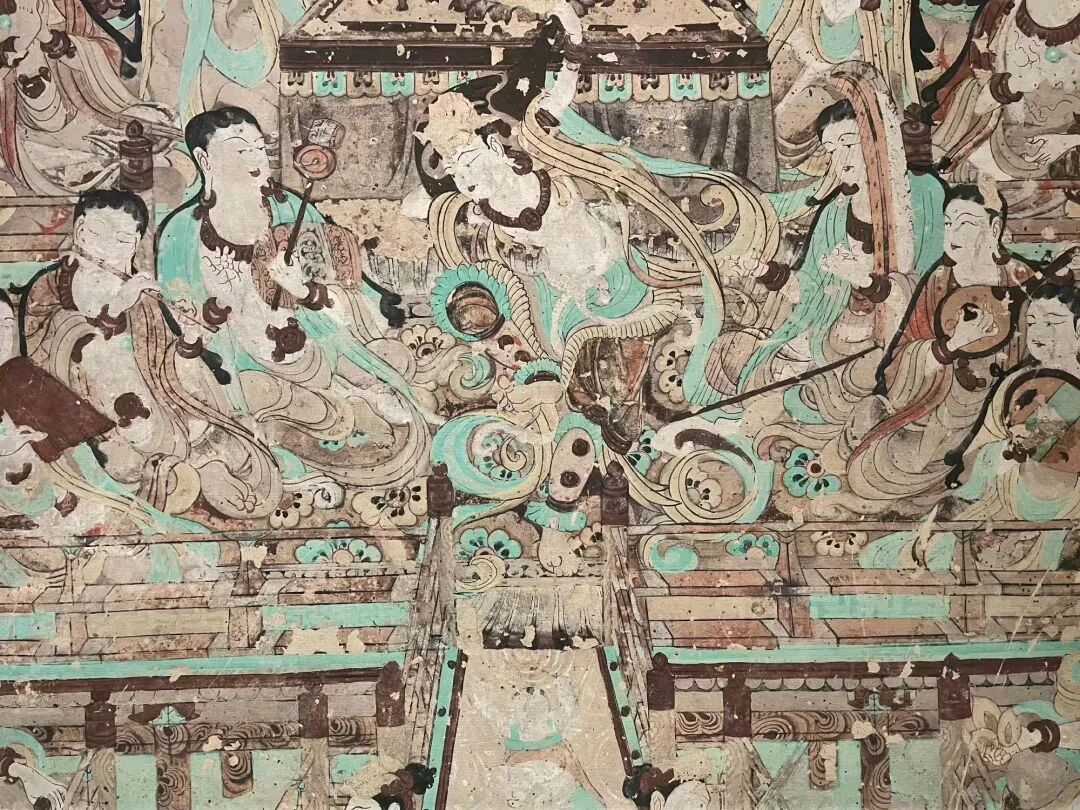 莫高窟第112窟 金刚经变之反弹琵琶舞与乐队,历史上王维除了诗文之外,亦精擅乐器音律。