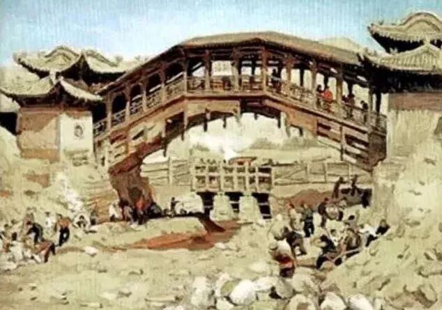 兰州雷坛河握桥,生于明永乐间,卒于1952年,为兰州八景之一“虹桥春涨”,因城市建设拆除,当时许多地方绅士出面阻拦未果。握桥建造方法特殊,在两岸堤坝插木,挑梁凌空对握,河中无柱,不惧水冲之患,称得上是建桥史上一次技术革命。