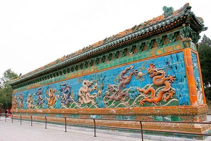 北海公园的九龙壁,用七色的琉璃砖瓦各镶嵌成九条巨龙,色泽鲜艳,形象逼真,好似腾云驾雾,要冲出墙壁,飞向天空。