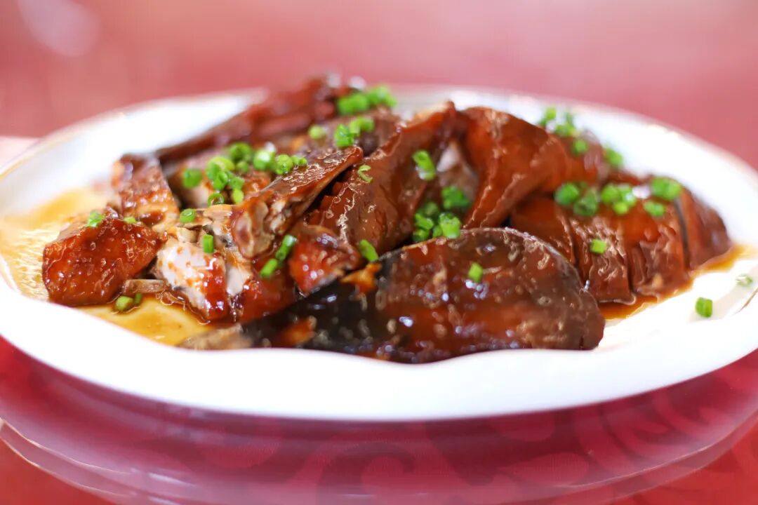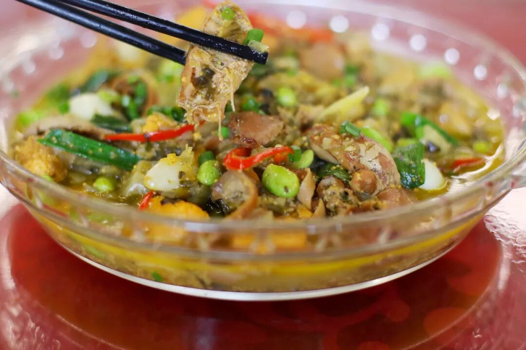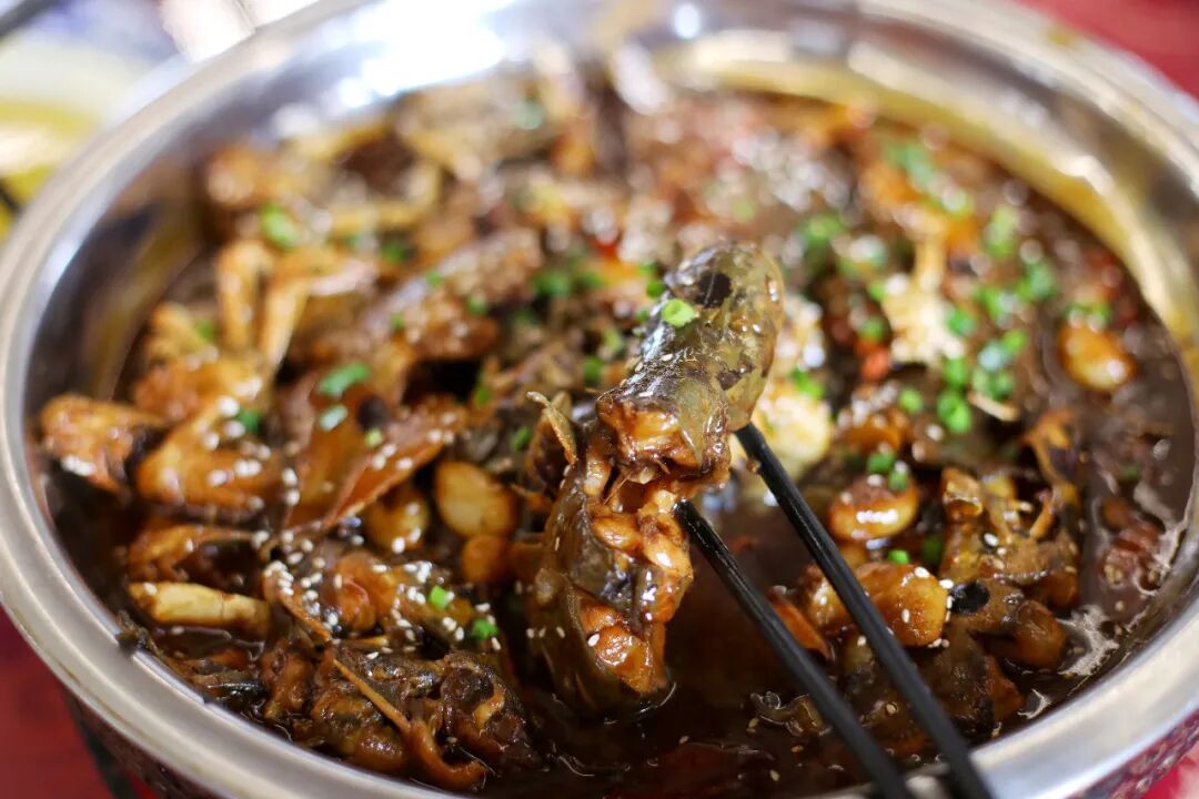 炒蚕蛹,香椿炒蛋,太湖白鱼,酱鸭,东坡肉,蚌肉,红烧杂鱼,河虾,油豆腐、土鸡、炒香青菜……