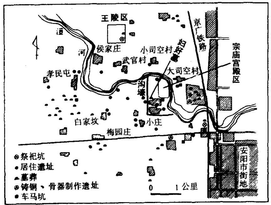 殷墟的总体布局和结构。安阳西北洹水两岸,以小屯村为中心,形成周边约36平方公里的商代晚期都城遗址。其中,小屯村东北为宫殿宗庙基址,有明显的前朝后寝、左祖右社建筑格局,小屯村北发现有制玉作坊,小屯村南发现有制作青铜器的铸铜作坊遗址,北辛庄南、大司空村南等均发现有制骨作坊遗址。