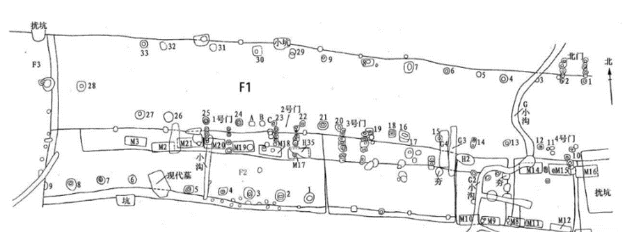 北排房基,东西长约60米,南北14.5米。南排房基,东西长约75米,南北7.3米。西排房基,南北约50米,东西7.5米。这三排房基中,北排房基应为主要建筑。现存三个门道,均宽二米,间距4.3米。中间门道西侧埋有东西排列的两个陶罐,东侧陶罐紧邻柱础石,西侧陶罐内发现一件有“武父乙”铭文的封口铜盉。“武父乙”,大概指殷王武丁之父小乙。在另一门道的西侧还发现两个东西排列的祭祀坑。两坑间距0.6米,均有殉葬砍头人骨架三具。头骨仍置坑内,头向东,并随葬盆、罍、尊等陶器及骨镞等器物。这种三排房基联成一体的建筑结构方式是少见的。