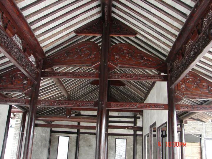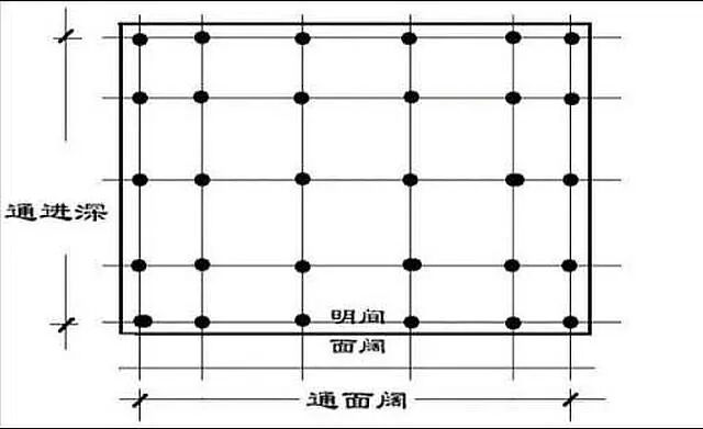 每四棵柱子围成一间,一间的宽为“面宽”,又称“面阔”,深为“进深”。