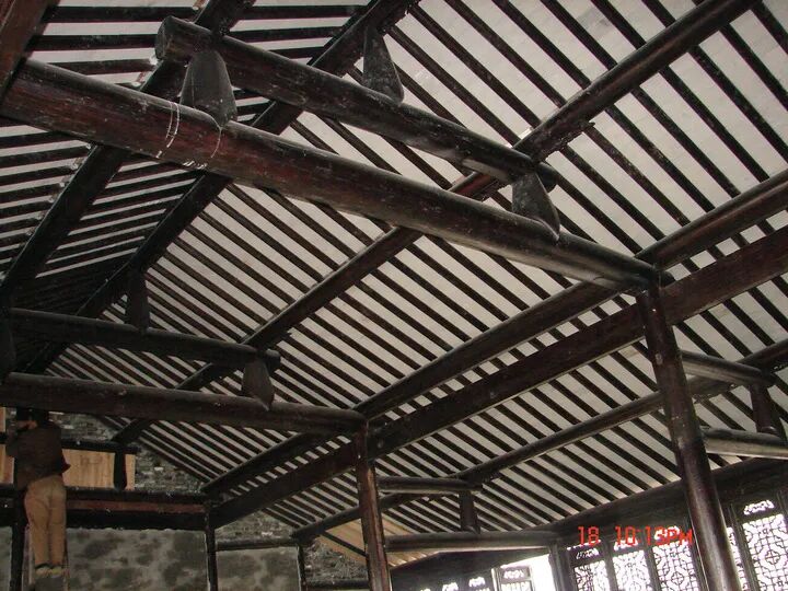 举架:所谓举架,指木构架相邻两檩中-中的垂直距离(举高)除以对应步架长度所得的系数,清代建筑常用举架有五举、六五举、七五举、九举等等。