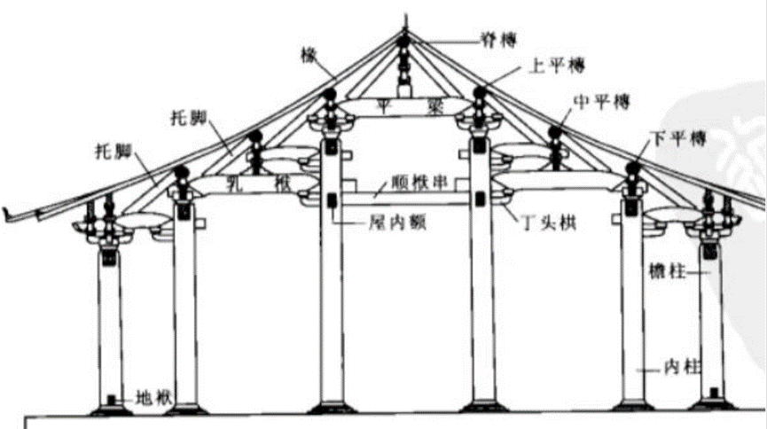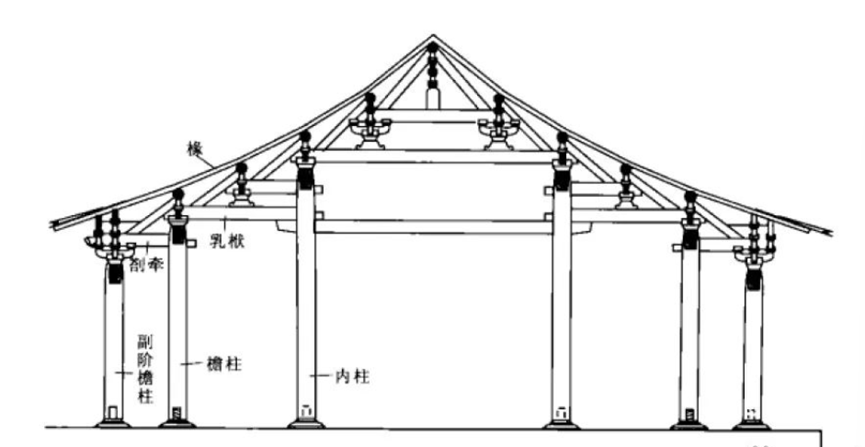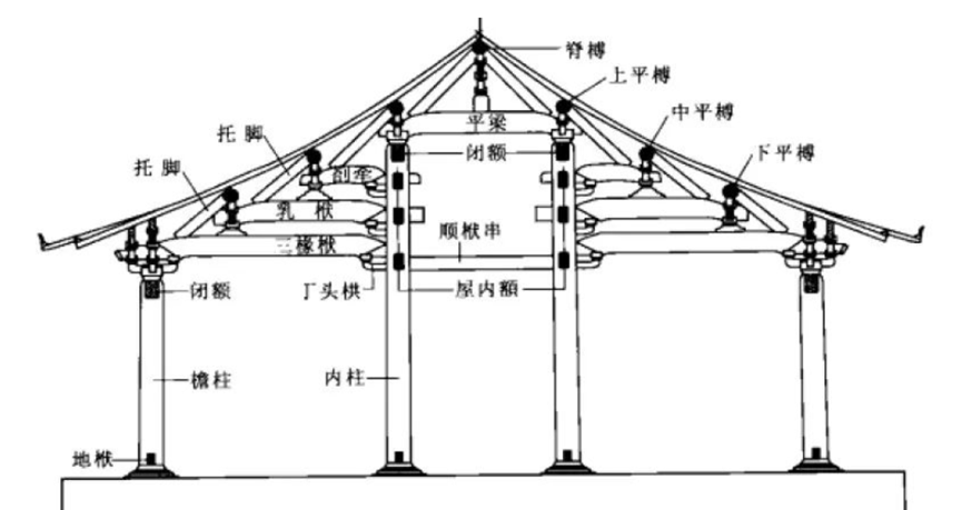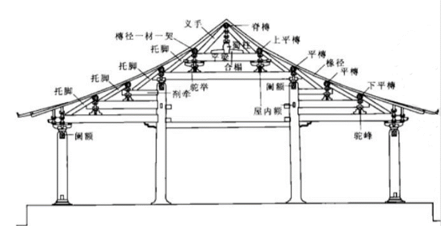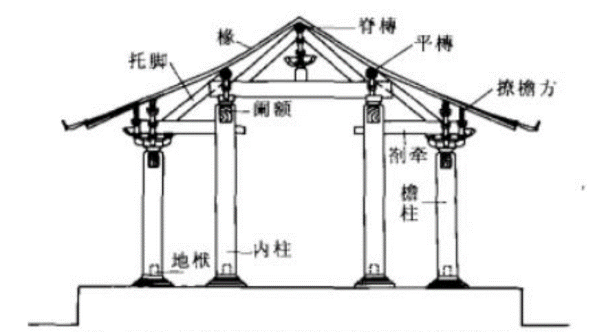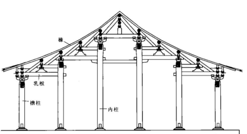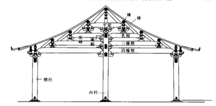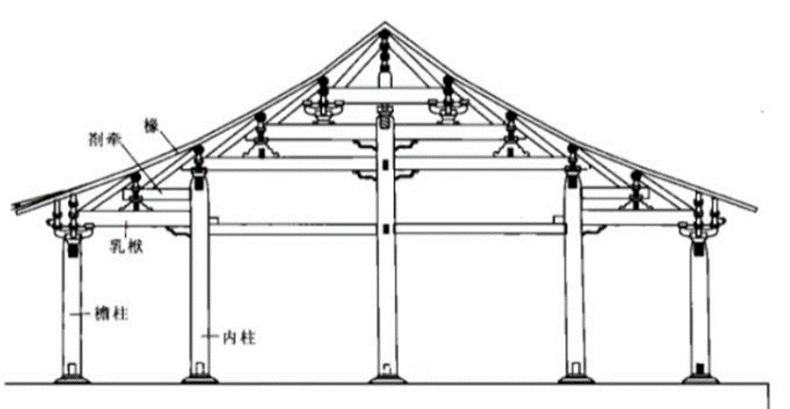 宋式建筑大木构架结构形式,为厅堂梁架侧样。此种形式较为简单,即梁架以上为四椽,四椽栿通达前后檐柱,构成室内单槽空间。