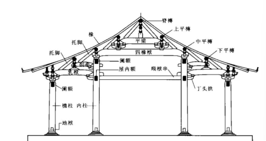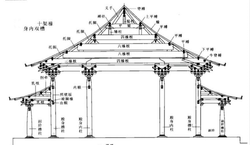 即分心柱及内柱与檐柱的空间布局,尽间柱排列与殿阁副阶相同,但在宋《营造法式》中厅堂侧样不设副阶,因此,也就不存在屋廊。十架椽中的脊步与平梁,构成两椽进深,其余八架椽均采用穿斗结构,由二椽栿、三椽栿、剳牵、乳栿等承托,顺栿串将分心柱(内柱)与内柱连接。