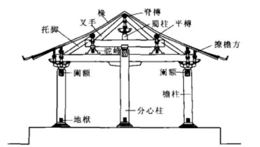 根据宋《营造法式》,此结构用于厅堂式建筑,三柱即前后檐柱与殿身内柱,而内柱处于建筑平面的中心位置,是为分心,内柱直通平梁底皮,将乳栿、三椽栿、四椽栿、五椽栿等梁栿,分割为前后两部分,此梁架实际为穿斗式与抬梁式结构的混合做法。