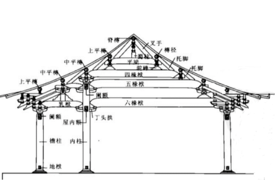 宋式建筑大木构架形式,厅堂结构做法,进深方向为五个空间布局,平梁以上为两椽进深,均采用穿斗式结构,所谓前后乳栿,是指前部与后部各置两根乳栿,并构成进深八架椽构造形式。