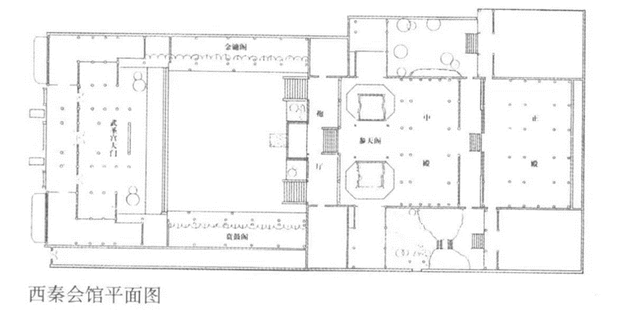西秦会馆建筑平面呈矩形,为中国传统建筑格式,占地总面积约3640平方米(第二版自贡市志则记为4000平方米,建筑面积约3000~3100平方米。建筑轴线分明,坐东南向西北方,四周由山墙、隔轩以及廊屋等次要建筑环绕。86米建筑中轴线上由外至内依次为武圣宫大门、献技诸楼、大丈夫抱厅、福海楼、抱厅、参天阁、中殿、正殿建筑。轴线两侧有外至里则是金镛和贲鼓阁、左右客廨、内院和神庖与内轩。
