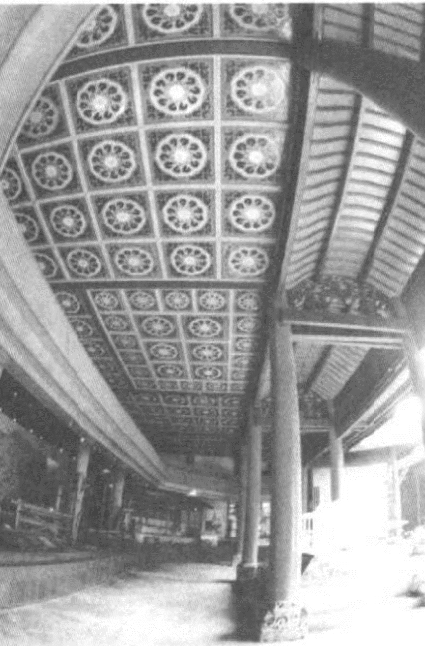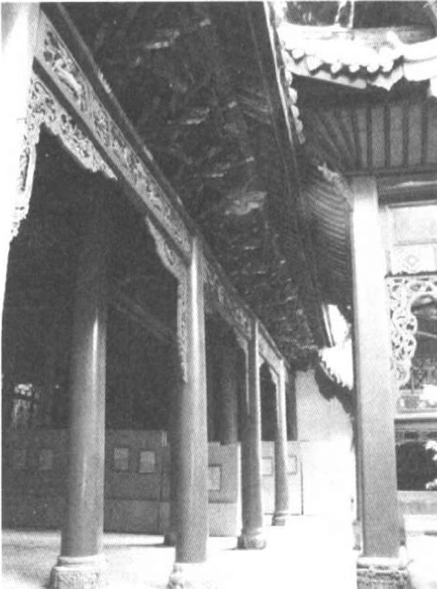 紧接参天阁的中殿是一座保存比较好的殿宇,两侧构筑封火山墙,双坡硬山屋顶。面阔5开间,进深6架椽。前后两坡不对称,前檐略高于后檐,檐下做斗拱,其作用已退化,主要作为装饰构件。有游龙、飞凤等雕刻其上,刀法圆熟。殿前方完全开敞,与参天阁及水池小院之间并无隔断,使这一狭小空间没有一点局促之感。屋顶正脊有“八仙过海”泥塑一组。中间采用抬梁结构,两山采用穿枋式结构,主要立柱为石制,榫卯结构已经发展到很高的水平。从框架结构,从斗拱制作以及屋顶装饰等方面看,均具有明显的清代宫室建筑特点。