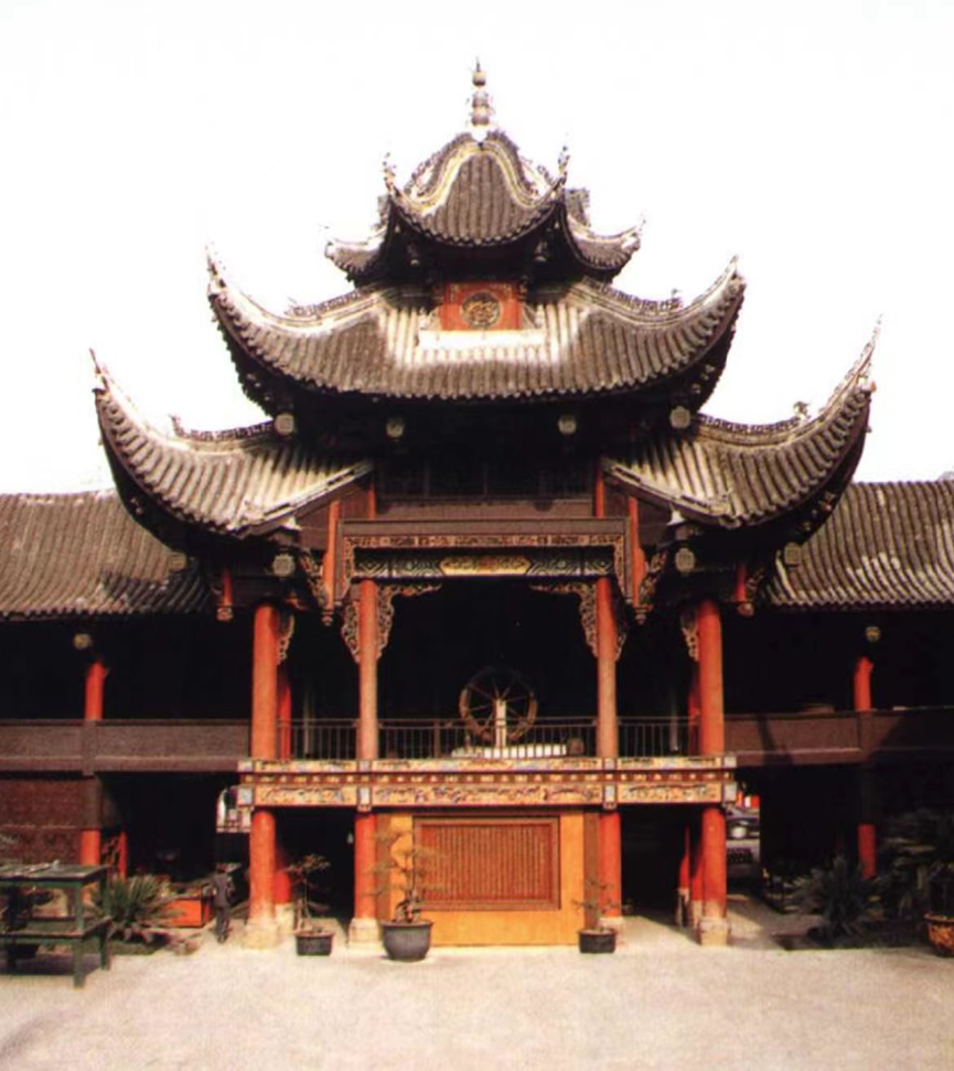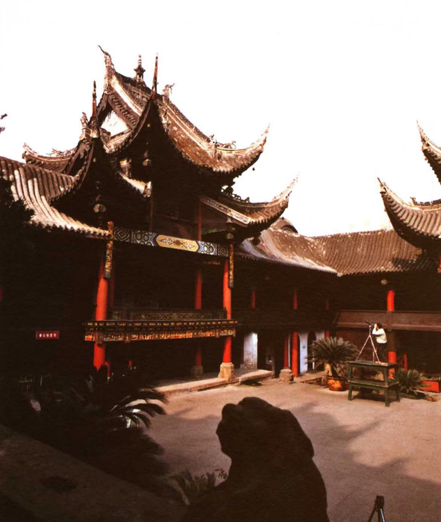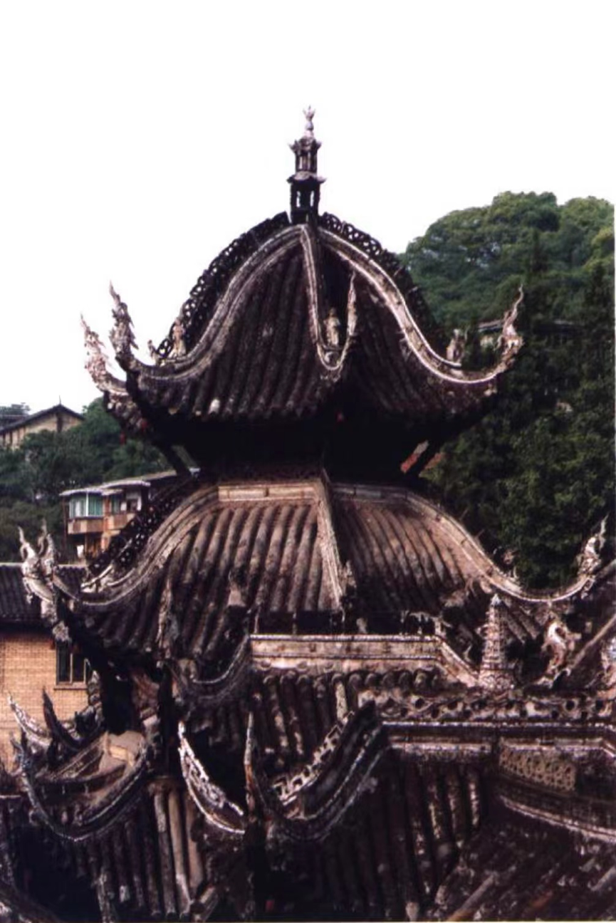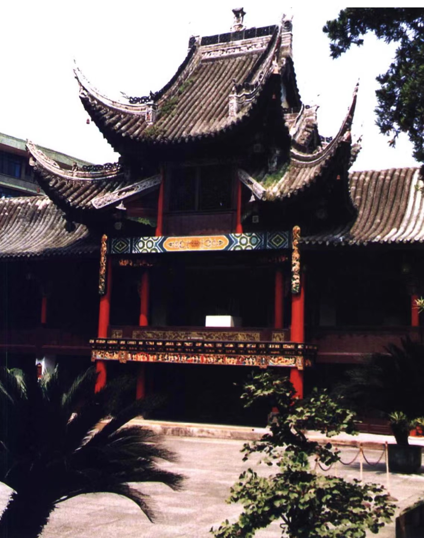 形成一座不可分割的复合建筑。宽约32米的武圣宫,为四柱七楼牌楼式门,其上为歇山屋顶,正中置瓦制宝顶一束,屋顶下左右飞出两列翼角,其型制颇似一 “人”字形飞雁队列,腾空而起,直插蓝天。