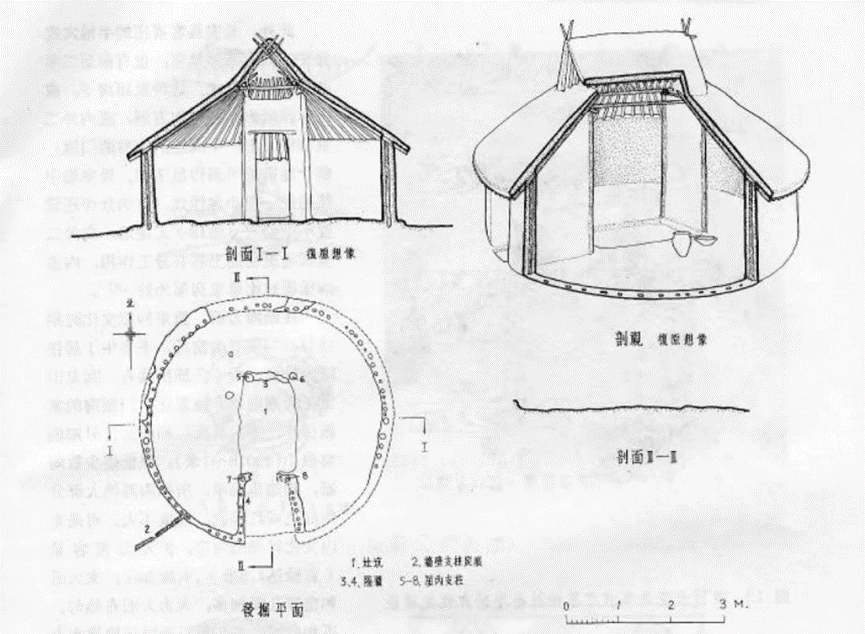 圆形房屋一般建造在地面上,直径约4~6米。周围密排较细的木柱,柱与柱之间也用编织方法构成壁体。室内有二至六根较大的柱子。屋顶形状可能在圆锥形之上,结合内部柱子,再建造一个两面坡式的小屋顶。