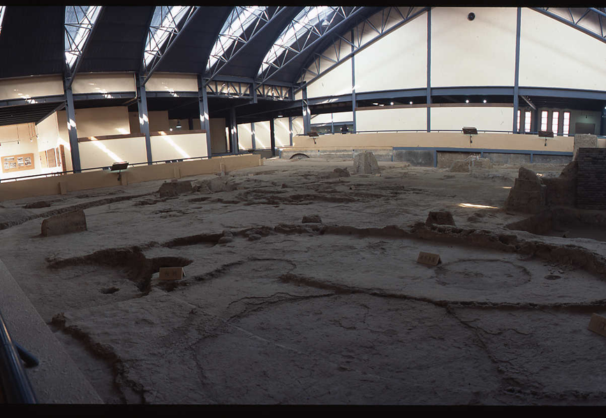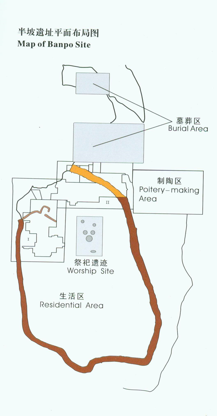半坡遗址位于陕西省西安市东郊浐河东岸、半坡村北,是黄河流域一处典型的原始社会母系氏族公社村落遗址,属新石器时代仰韶文化,距今 6000 年左右。1952 年发现,1954-1957年发掘,面积约5万平方米,已发掘出45 座房屋、200多个穴、6座陶窑遗址250座墓葬,出土生产工具和生活用品约 1万件还有栗、菜籽遗存。其中房屋有圆形方形半地穴式和地面架木构筑之分。半坡遗址是我国首次大规模揭露的一处新石器时代村落遗址。