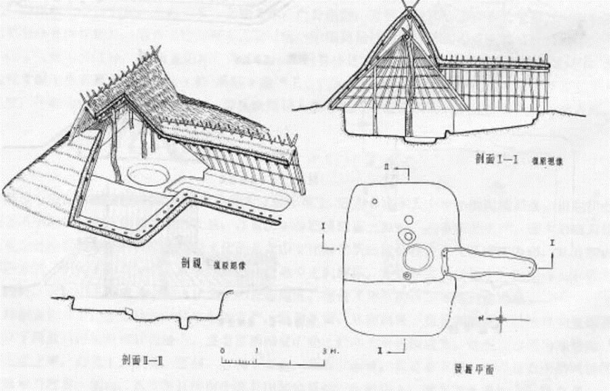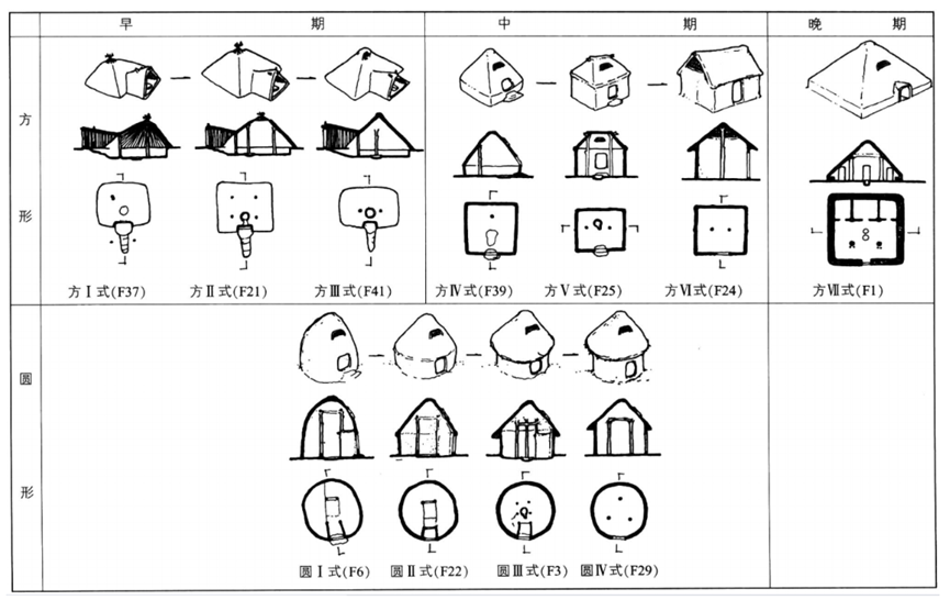 早期仅见方形。其发展概况是,平面由方形趋于长方形;穴由深而浅,中柱布置由不规则到规则;火塘由篝火式的极浅的凹面发展为圆形浅坑,并有灶陉萌芽;顶部排烟通风口由椽柱交接的节点移至前坡顶端,内部椽木开始涂泥防火;卧寝部分的居住面高起,并出现“灸地”的防潮、防寒措施。晚期内部空间用木骨泥墙分隔成几个空间,即突破了原来一个体形一个空间的简单形式,而形成分室建筑。