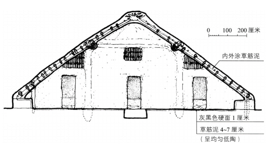 据半坡材料,可知柱和椽是先于墙出现的。初期没有墙体,围护结构的“四壁”是削地而成。居住区周围的拦护壕堑,也是削地而成。对于土结构,开始还不掌握叠筑技术,增筑壁立的泥土结构,是后来才有的。墙体出现之初,它与屋盖区分并不明确。进一步发展,墙体骨架又分化为较粗的主要承重支柱与较细的填充结构的骨架。此时,作为木骨泥墙,在结构、构造上方始完备。