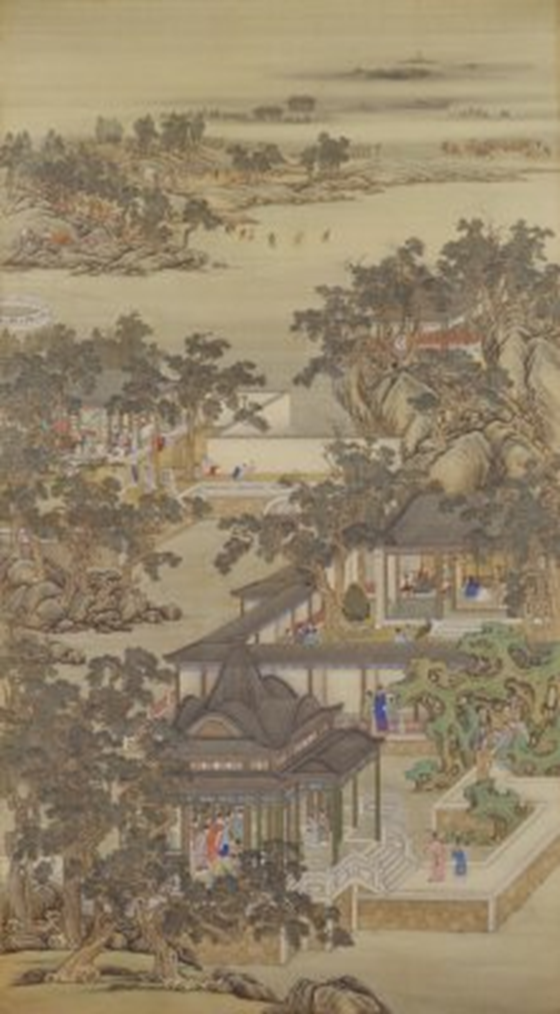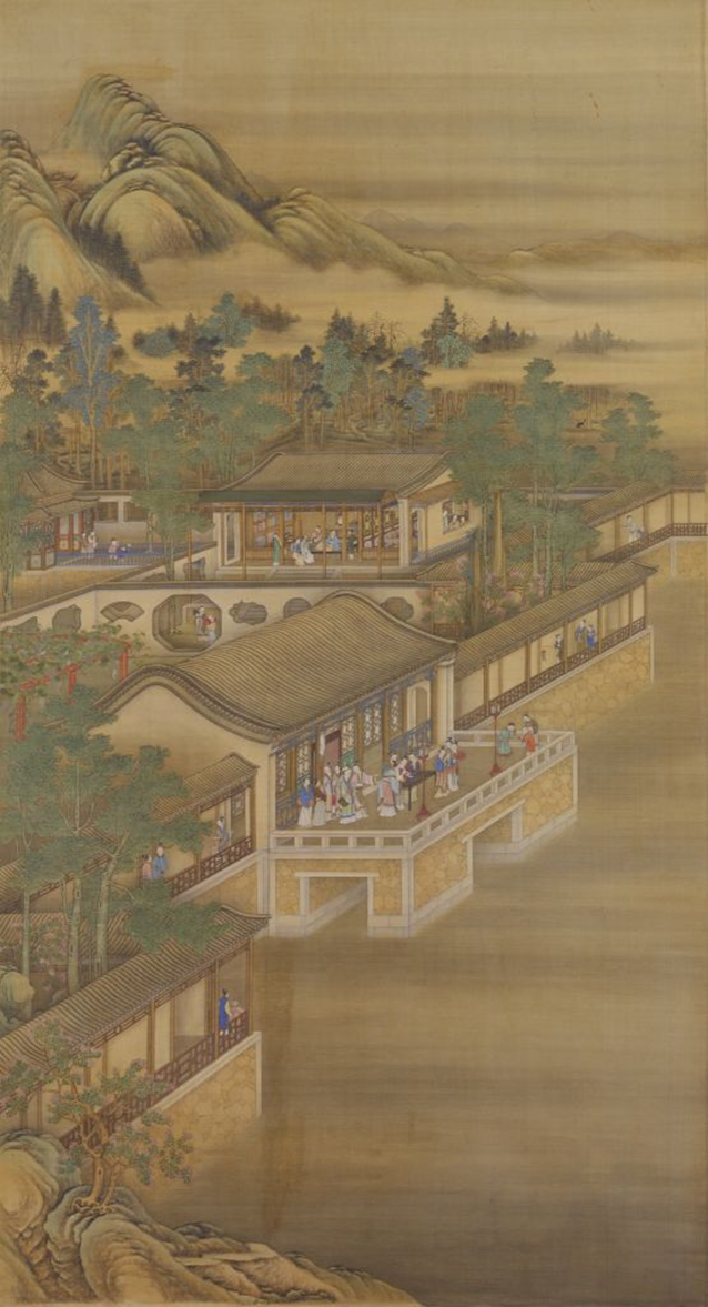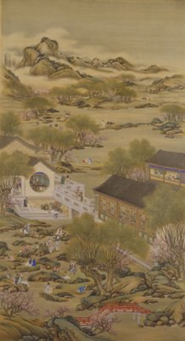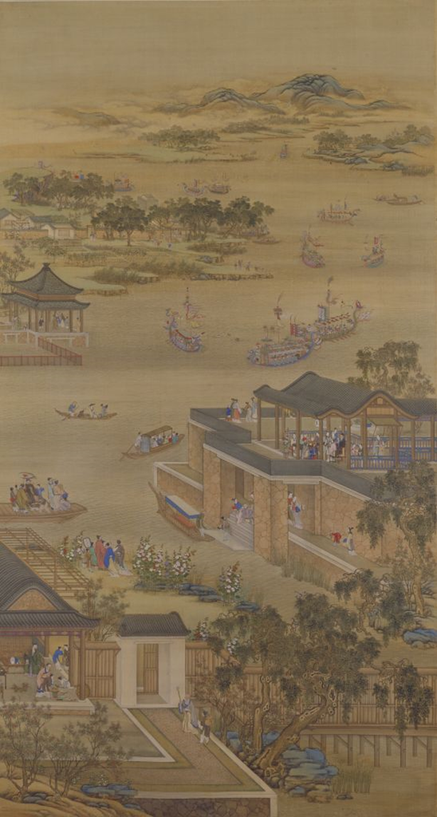这是一组表现雍正皇帝日常生活的作品,按春、夏、秋、冬四季12个月的顺序排列,分别为“正月观灯”、“二月踏青”、“三月赏桃”、“四月流觞”、“五月竞舟”、“六月纳凉”、“七月乞巧”、“八月赏月”、“九月赏菊”、“十月画像”、“十一月参禅”和“腊月赏雪”。从描绘的景物判断,表现的对象应为圆明园。画面以山水楼阁为主,建筑描绘细腻,其中既有中式园林建筑,又有西式亭台楼阁,更有中西合璧者,画面的景观可能是画家以圆明园的建筑结合自己的想象而创作的。