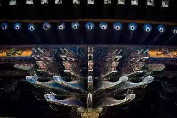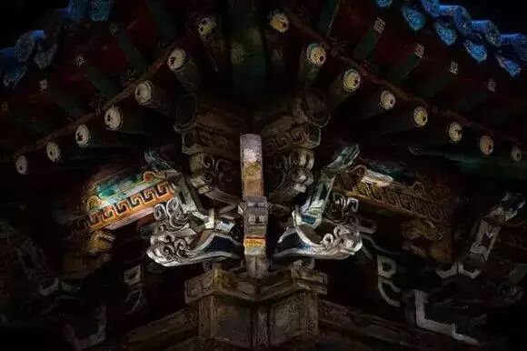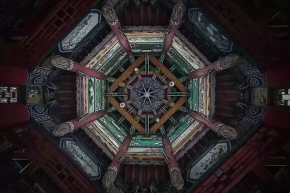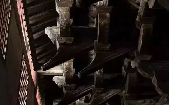 斗拱——由一层层斗和拱纵横叠加而构成,斗与拱之间完全用榫卯连结,不用一根铁钉,充分表现了中国木结构柔性连结的特性。