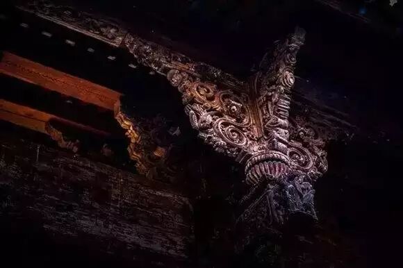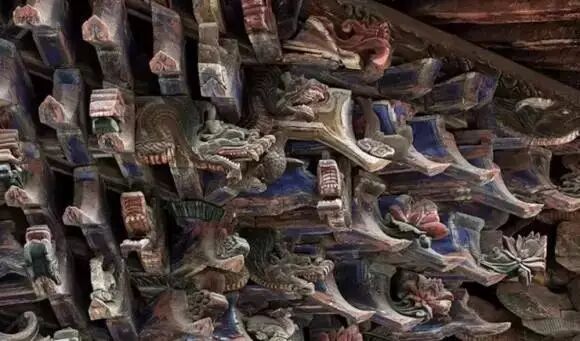 地方做法中的斗拱,总是有着丰富的个性和表情,它虽与官式斗拱一脉同宗,但却掩盖不了世俗美学那种强烈的冲动。首先在使用范畴上大大突破了官式建筑的剪辑,同时在形象上也大大丰富起来。比如山西的许多庙宇建筑,除了在翘头昂尖上做些文章不算,还经常在斗拱上堆叠各种装饰,让寓意吉祥的狮、象、莲花都参与到斗拱的组成中来——这些都是官式建筑所摒弃的,但在地方审美中则大受欢迎。
