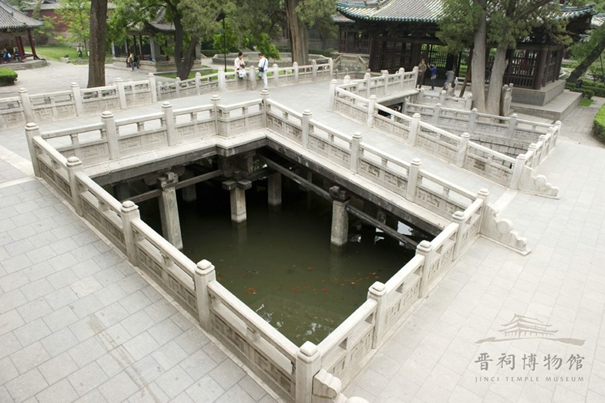 鱼沼飞梁位于圣母殿与献殿之间,方池之上架十字形桥,在池中立石柱34根,柱头普柏枋相联,上置大斗,斗上施十字相交之拱,承托梁枋。东西宽广,南北下斜如翼,与圣母殿上翘的翼角遥相呼应,显示了殿翅欲飞之势。