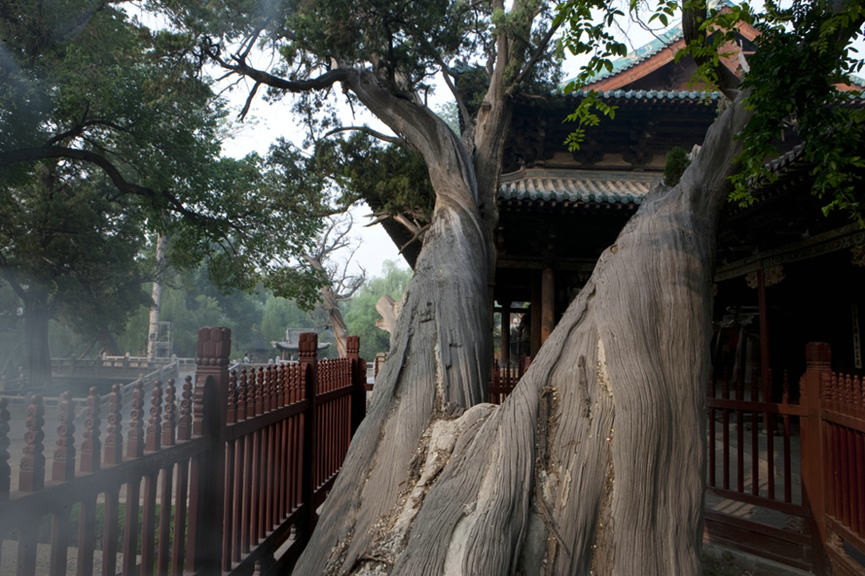 周柏唐槐,二者都是晋祠千年古木的代表。周柏是周代种植的柏树,茂盛葱郁,位于圣母殿北侧,原先本有两株,名为齐年古柏,如今只剩这一株。周柏唐槐树干粗壮,需数人才能合围。唐槐是唐代时种植的槐树,位于水镜台前,是晋祠古树中最繁茂的一株。每到春夏之季,树绿荫浓。