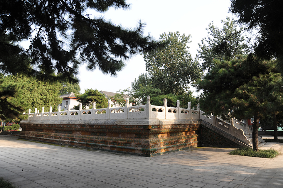 先农神坛,位于太岁殿西南方,始建于明朝嘉靖年间,乾隆十九年重建。先农神坛为砖石结构的方形平台,坐北朝南,台面高出地面1.5米,边长15米多,四面各出8级台阶,青石阶条石,坛面金砖墁地。明清时期,仲春时节皇帝亲临或遣官来此拜祭先农。