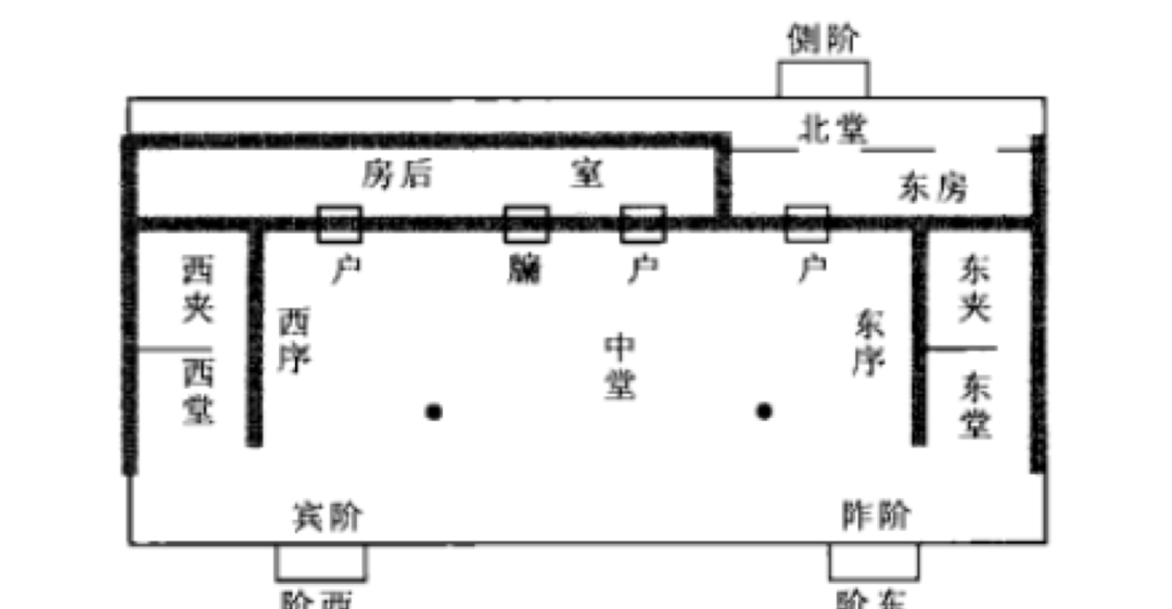 古建筑使用功能在室内平面上的分布。发现于西安半坡遗址的大房子,最早表现了“前堂后室”的设计思想,其室内分为四个空间,进门是一个大空间,后面出隔墙分为三个小空间,关于这四个空间的分析,一般认为出于公共活动和私密生活而划分,即小空间为主人起居之用,大空间可能是氏族聚会的场所,基本形成了在前的“堂”与在后的“室”组合的“前堂后室”格局。对后世宫室总体规划影响深远,这种影响在民居房屋建筑中得到发展。