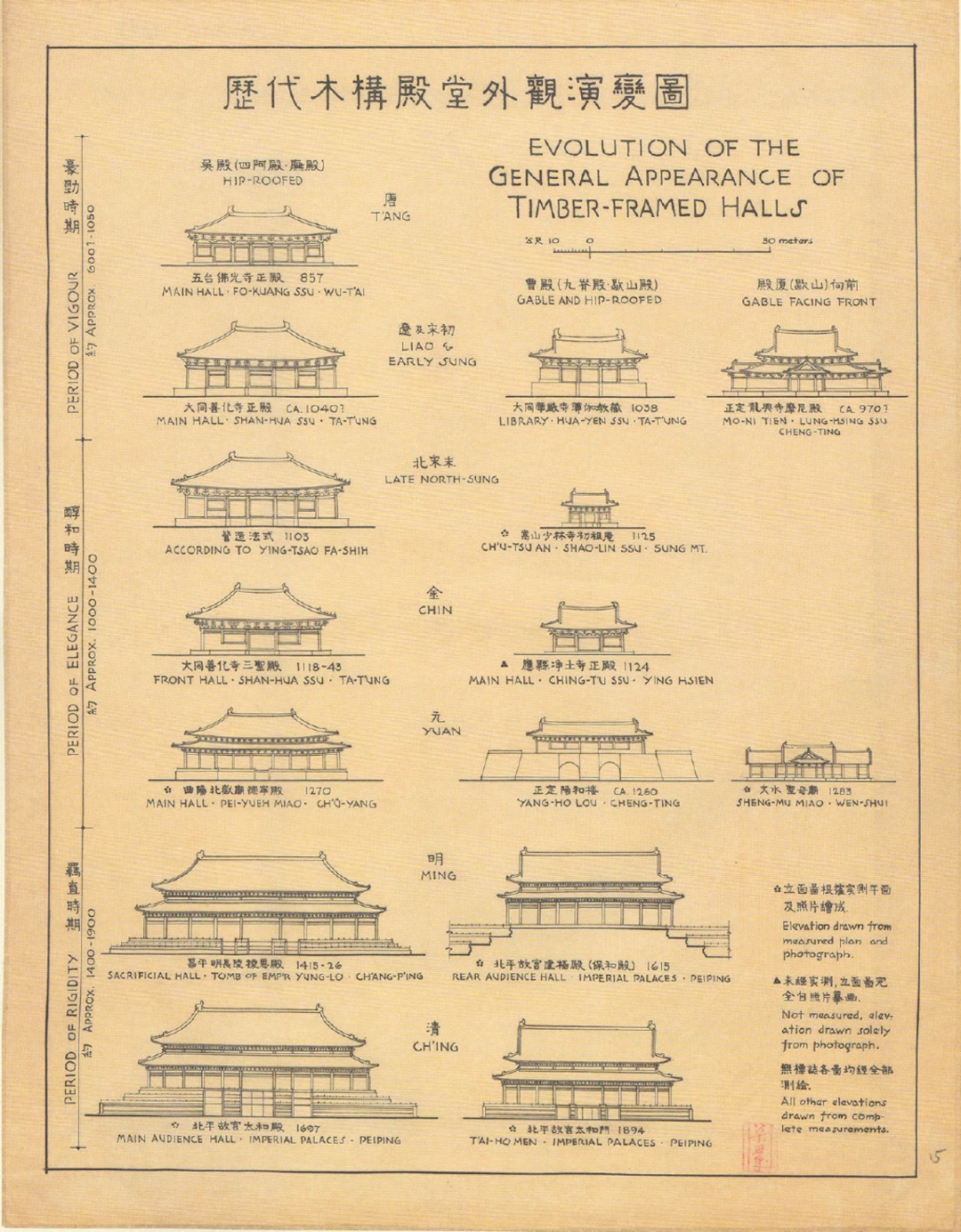 历代木结构殿堂外观演变图手稿(图源梁思成先生手稿,仅用于学习交流)